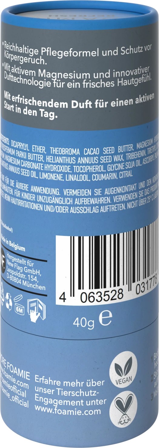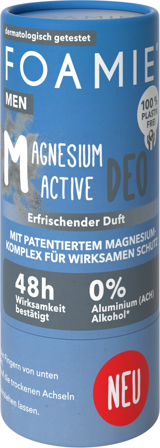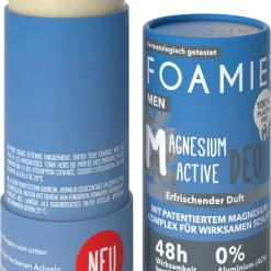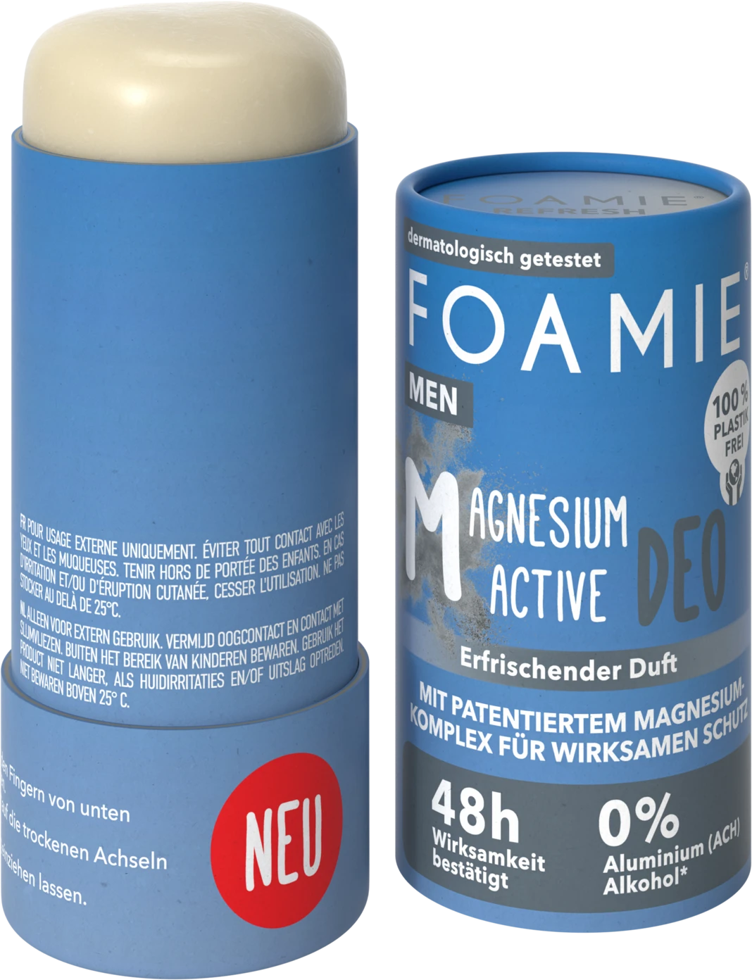 Foamie vervollständigt deine plastikfreie Pflegeroutine im Badezimmer mit dem NEUEN Festen Deodorant. Refresh für Männer bietet dir nachhaltige und zugleich reichhaltige Pflege mit patentiertem Magnesiumkomplex und einem intensiven erfrischendem Duft für ein anhaltendes frisches Hautgefühl. Der aktive Magnesiumkomplex kontrolliert das Wachstum und die Aktivität von Bakterien, bietet wirksamen Schutz gegen Körpergeruch und absorbiert Schweiß und Talg. Dadurch neutralisiert das Deodorant schlechte Gerüche für 48 Stunden ohne die natürliche Schweißproduktion zu blockieren. Der Stick ermöglicht eine einfache Anwendung – perfekt für zu Hause und auf Reisen.