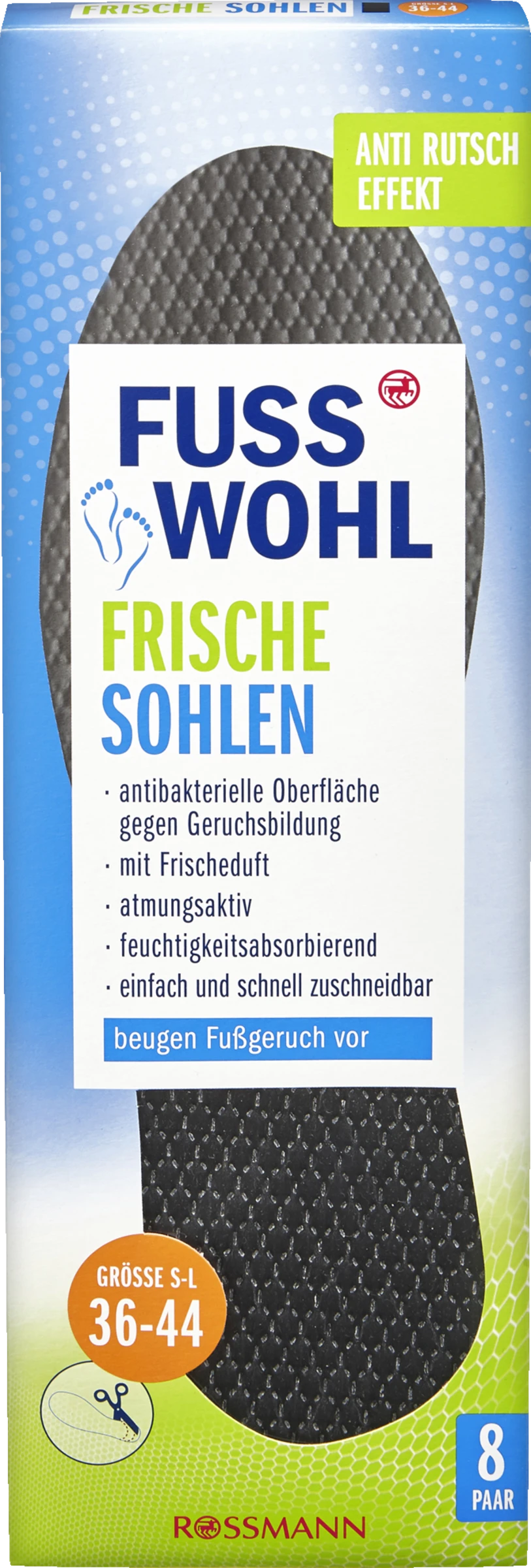 Die ultradünnen, atmungsaktiven FUSSWOHL FRISCHESOHLEN mit Mikroduftkapseln verleihen hygienische Fußfrische bis zu 7 Tage. Antibakterielle Wirkstoffe beugen geruchsbildenden Bakterien auf der Sohle vor. Optimaler Tragekomfort dank hoch saugfähigem Cellulosekern, der Feuchtigkeit absorbiert. Mit Anti-Rutsch-Effekt für angenehmen Halt. Hautverträglichkeit dermatologisch bestätigt. Einfach an einer Stelle passgenau zuschneidbar. Mit Frischeduft. Atmungsaktiv. Feuchtigkeitsabsorbierend. Mit Anti Rutsch Effekt.
