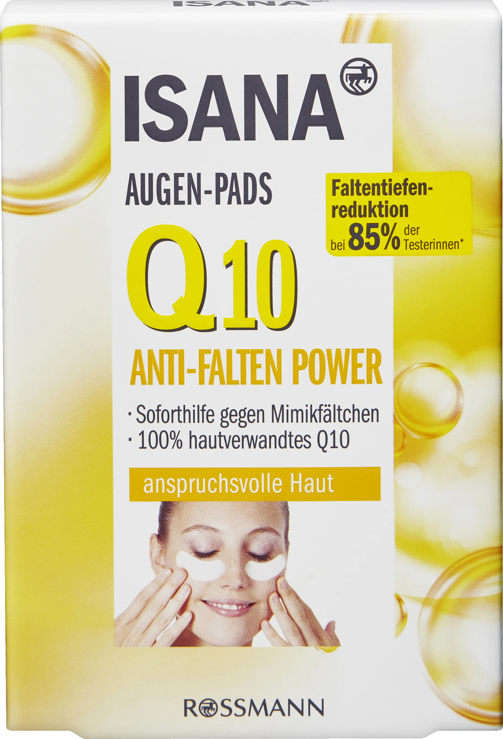 ISANA Q10 Anti-Falten Augenpads vitalisieren und reduzieren nachweislich dieFaltentiefe von Augenfältchen.** Faltentiefenreduktion bei 85 % der Testerinnen*. Soforthilfe gegen Mimikfältchen. 100% hautverwandtes Q 10.Anspruchsvolle Haut. WIRKUNG: Q10 hat antioxidative Eigenschaften und ist ein Energielieferant der Zellen. Grüner Tee-Extrakt erfrischt die zarte Augenpartie.Die ISANA Q10 ANTI-FALTEN Augenpads reduzieren die Faltentiefe nachweislich. *Bei 85% der Testerinnen wurde nach 30 Minuten ein positiver Effekt hinsichtlich der Faltentiefe nachgewiesen.** in-vivo Studie zur Faltentiefenreduktion an 20 Probanden, Einmalanwendung. Hautvertäglichkeit: dermatologisch bestätigt.