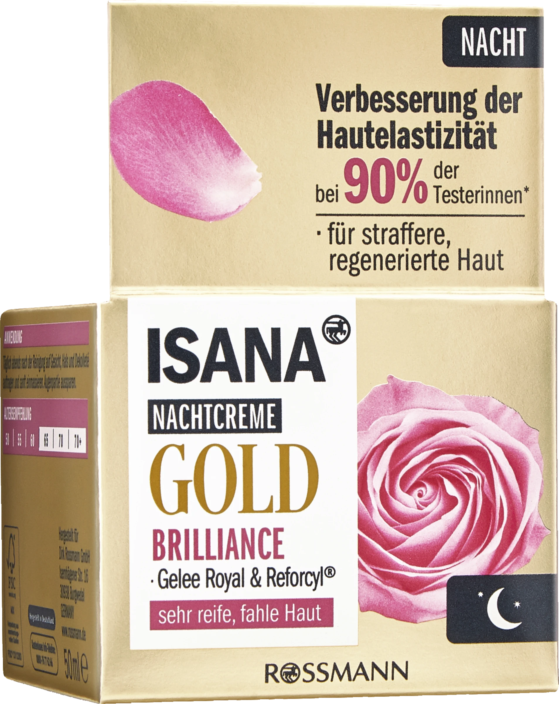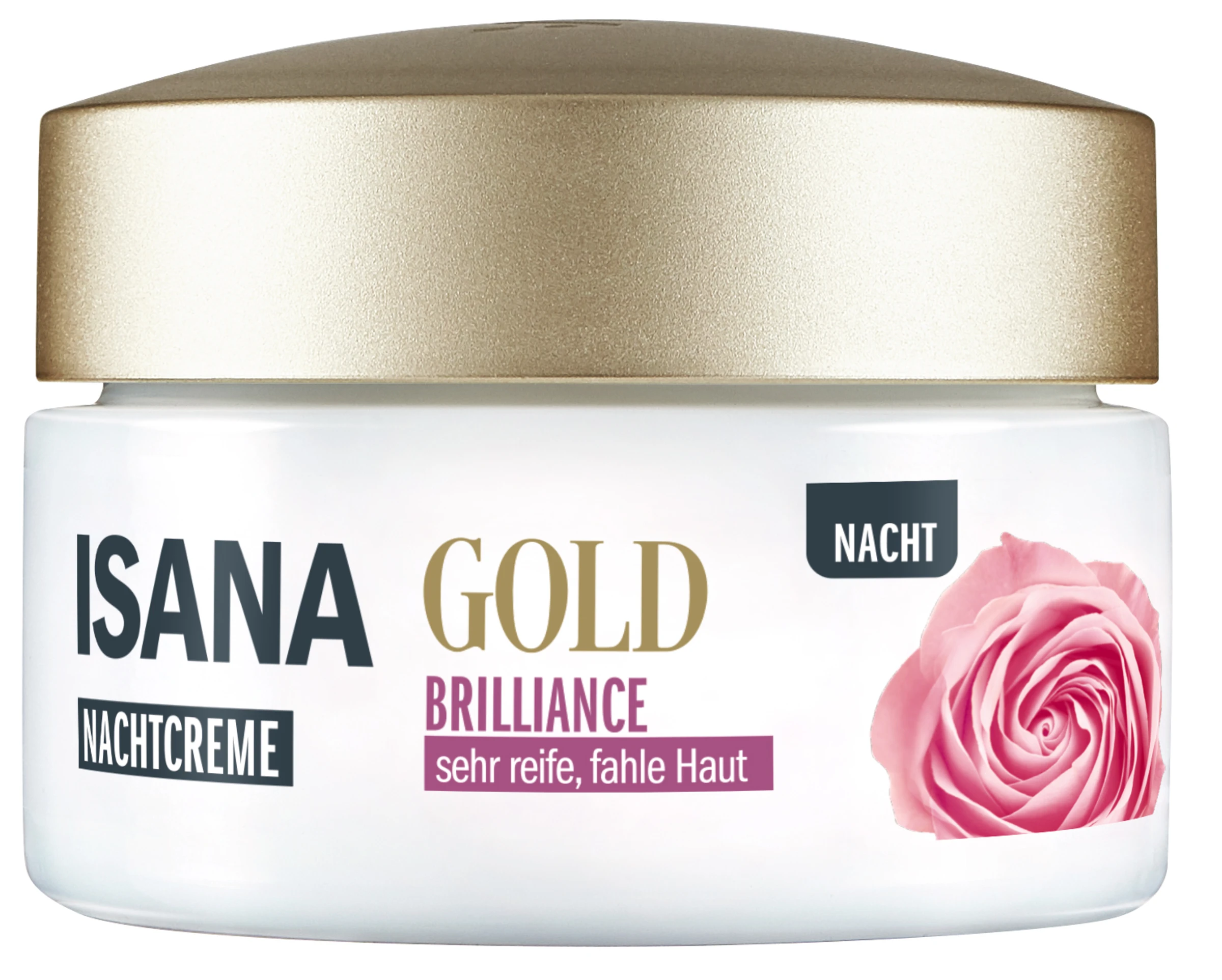 Die ISANA GOLD BRILLIANCE NACHTCREME mit wertvollen Inhaltsstoffen wie Gelee Royal und Reforcyl® regeneriert gezielt sehr reife, fahle Haut. Nachweislich wird die Hautelastizität verbessert*.