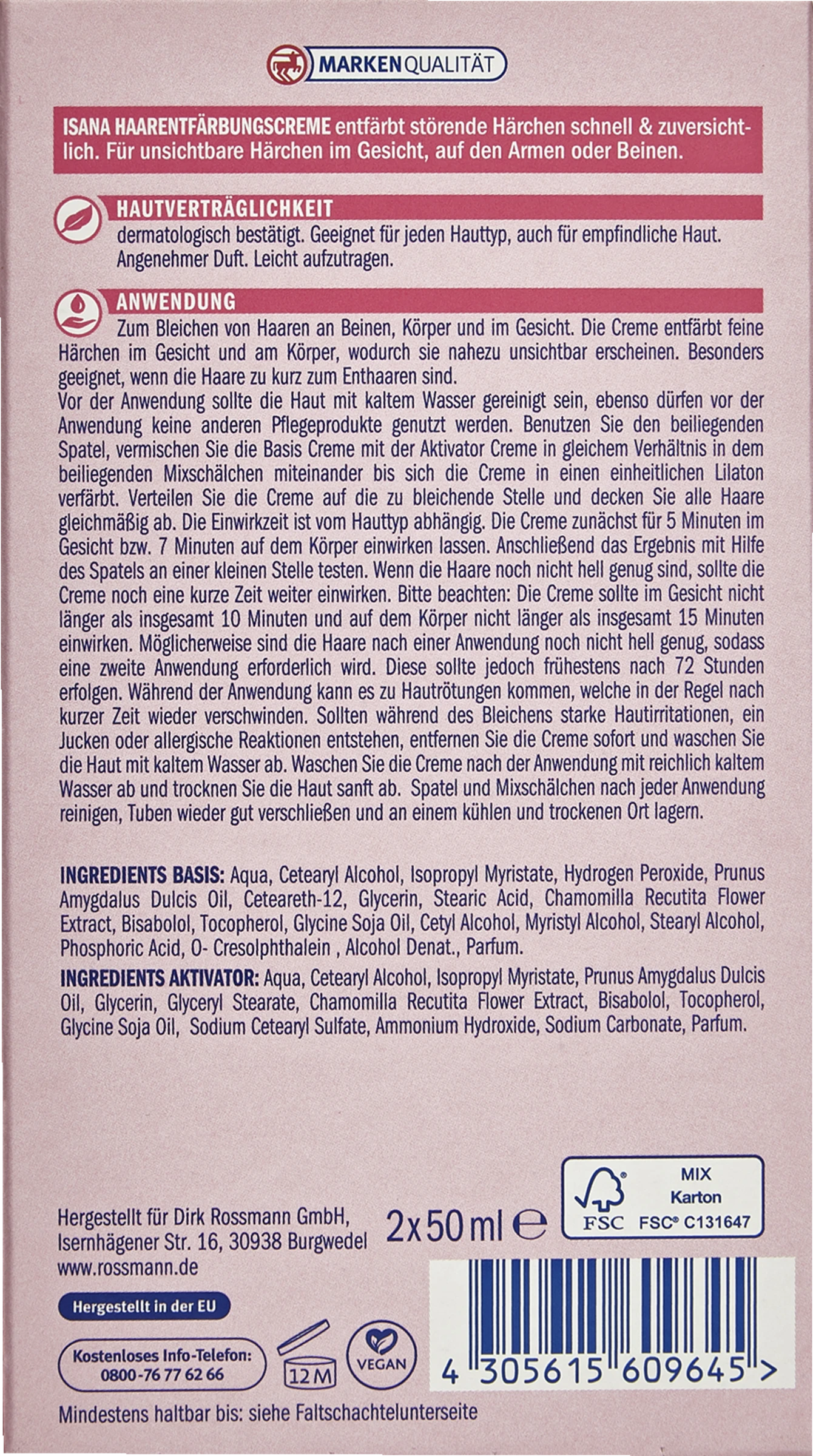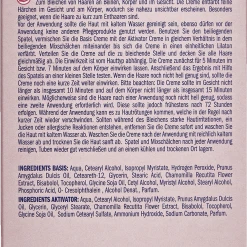 Aqua, Cetearyl Alcohol, Isopropyl Mystritate, Hydrogen Peroxide, Prunus Amygladus Dulcis Oil, Ceteareth-12, Glycerin, Stearic Acid, Chamomilla Recutita Flower Extract, Bisabolol, Tocopherol, Glycine Soja Oil, Cetyl Alcohol, Myristyl Alcohol, Stearyl ALcohol, Phosphoric Acid, O-Cresolphthalein, Alcohol Denat, Parfum