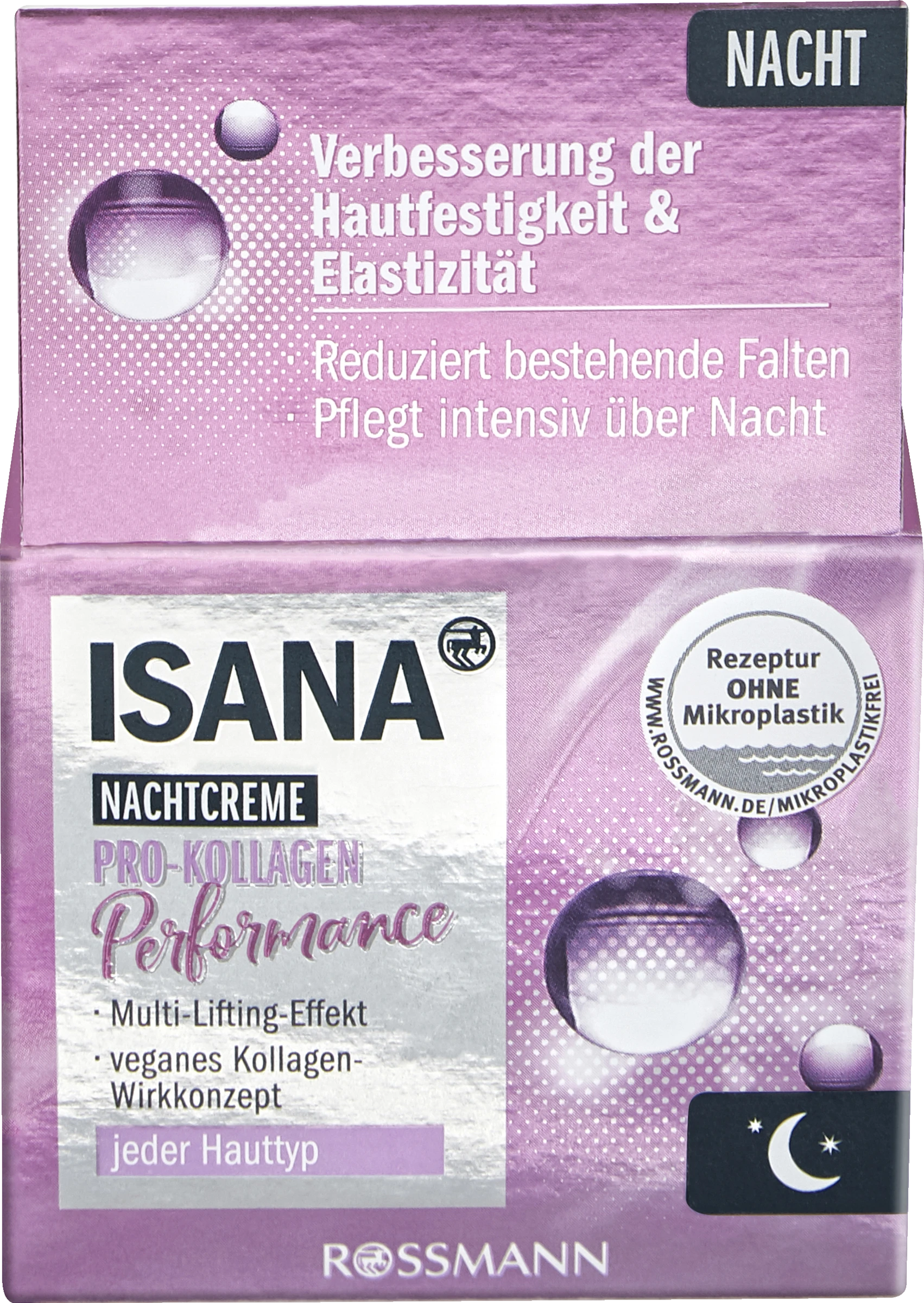 Die ISANA PRO-KOLLAGEN PERFORMANCE NACHTCREME mit ihrer modernen Anti-Aging Textur sorgt für einen Multi-Lifting-Effekt und lässt die Haut langfristig prall und straff erscheinen. Die Pflege wurde entwickelt, um die Kollagensynthese der Haut anzuregen und so ihre Elastizität zurückzuerlangen. Gleichzeitig mildert die Nachtcreme Falten und Linien.
