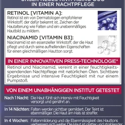 Die Revitalift Laser Gepresste Anti-Falten Pflege Nacht mit Retinol + Niacinamid von L’Oréal Paris mildert sichtbar Falten und korrigiert zugleich ein unebenmäßiges Hautbild. Dank enthaltenem Retinol [Vitamin A], ein von Dermatologen empfohlener Wirkstoff, wird den sichtbaren Anzeichen der Hautalterung effektiv entgegengewirkt. Niacinamid ist ein essenzieller Wirkstoff, der die Haut pflegt und durch seine aufhellenden Eigenschaften für einen gleichmäßigen Hautton sorgt. Die innovative Press-Tiegel-Technologie sorgt für eine hygienische Anwendung und leichte Dosierung. Nach einer Nacht fühlt sich die Haut intensiv mit Feuchtigkeit versorgt und genährt an. Nach 14 Nächten werden Falten sichtbar gemildert. Der Teint ist ebenmäßiger. Die Haut am Hals ist straffer. In 4 Wochen verbessern sich die Faltenmilderung und die Ebenmäßigkeit des Hauttons weiter. Die Haut ist glatter und strahlender.