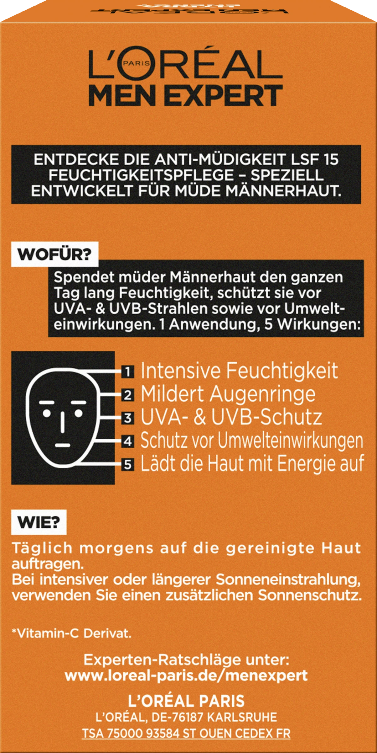 Die L’Oréal Paris Men Expert Hydra Energy 24h Feuchtigkeitspflege mit LSF 15 wurde speziell für empfindliche und müde Männerhaut entwickelt. Dabei eignet sich die Gel-Creme optimal für die Anwendung im Gesicht und zeichnet sich vor allem durch ihre belebenden Eigenschaften aus. Anregende Inhaltsstoffe wie Guarana und Vitamin C lassen die Haut den ganzen Tag frischer und wacher aussehen. Zudem wirkt die Gesichtspflege für Männer Augenringen dank der innovativen Energy-Oxygen-CP-Technologie entgegen. So wird die Haut langanhaltend hydratisiert und gefestigt. Gleichzeitig schützt die Tagespflege mit LSF 15 vor den negativen Auswirkungen von UV-Strahlung. Die leichte Anti-Müdigkeits-Pflege für Männer zieht sofort ein, ohne zu kleben oder Rückstände zu hinterlassen. Bereits nach kurzer Zeit bewirkt die Feuchtigkeitspflege, dass sich der Teint mit neuer Energie auflädt – für ein erfrischtes und rundum verbessertes Hautbild.
