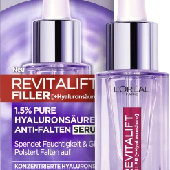 L’Oréal Paris Revitalift Filler [+Hyaluronsäure] Aufpolsterndes Anti-Falten Serum mit 1.5% Hyaluronsäure glättet die Haut und versorgt sie sofort mit Feuchtigkeit. Bereits nach der ersten Anwendung fühlt sich die Haut aufgepolsteter und glatter an. Das Revitalift Filler (+ Hyaluronsäure) Anti-FaltenSerum versorgt die Haut sofort intensiv mit Feuchtigkeit und polstert sie auf. Während langkettige Hyaluronsäure einen hydratisierenden Film auf der Hautoberfläche bildet und der Verlust der hauteigenen Feuchtigkeit deutlich vermindert wird, dringt kurzkettige Hyaluronsäure tiefer in die Haut ein und füllt dort die Feuchtigkeitsdepots der Haut auf. Mit 0,5% Macro-Hyaluronsäure und 1% Micro-Hyaluronsäure enthält das Revitalift Filler (+ Hyaluronsäure) Anti-Falten Serum insgesamt 1,5% Hyaluronsäure. Entwickelt für eine effektive Faltenminderung, sorgt es für eine prallere, geschmeidigere und jugendlicher aussehende Haut.