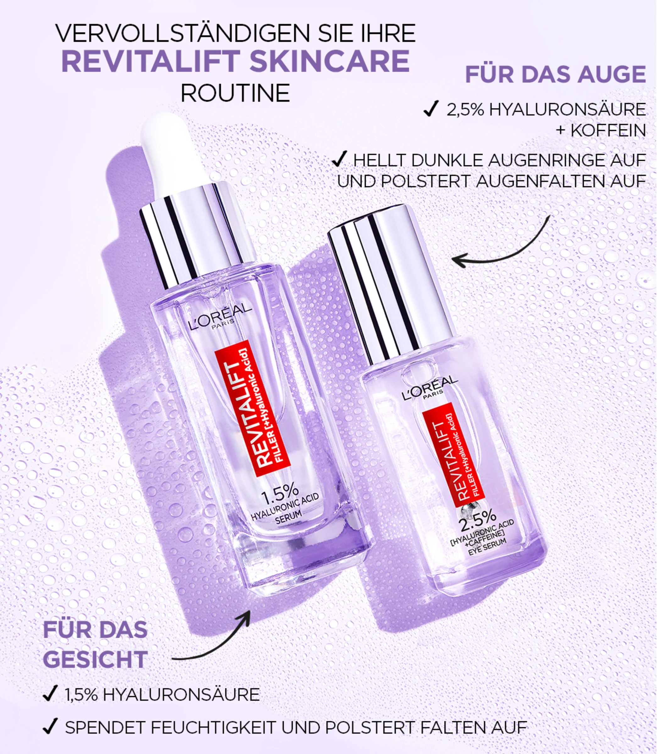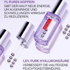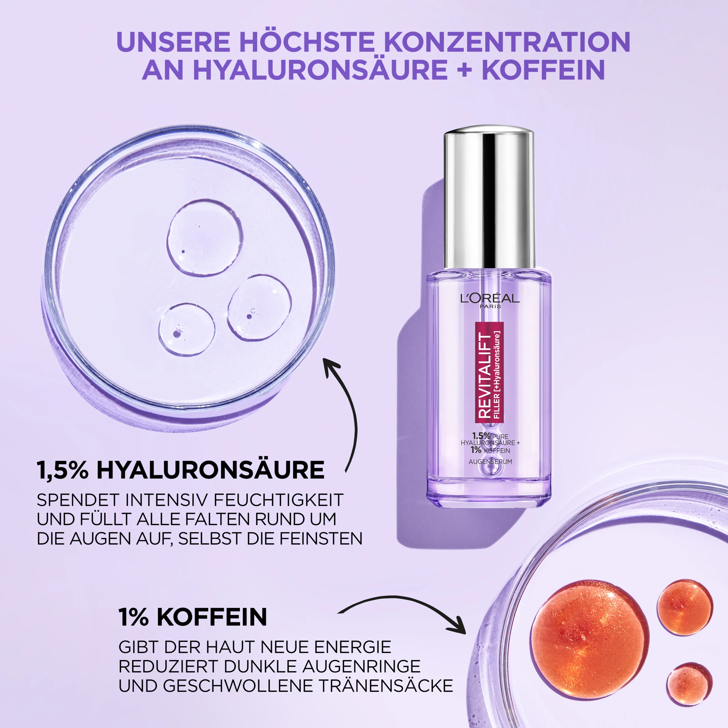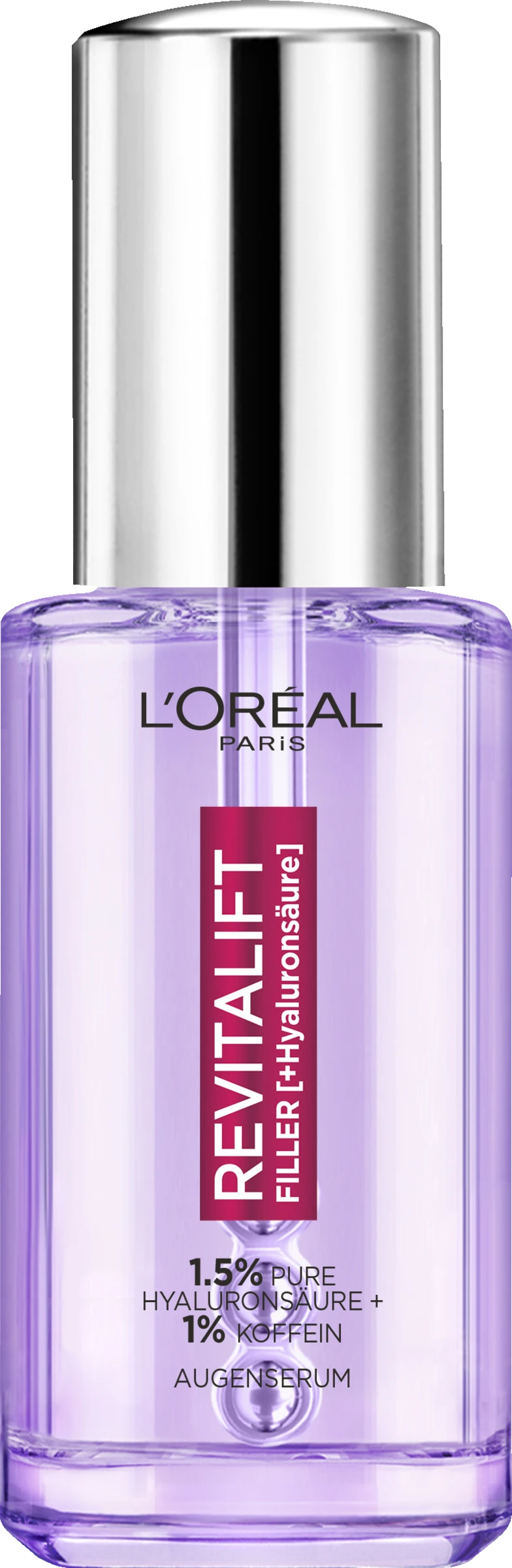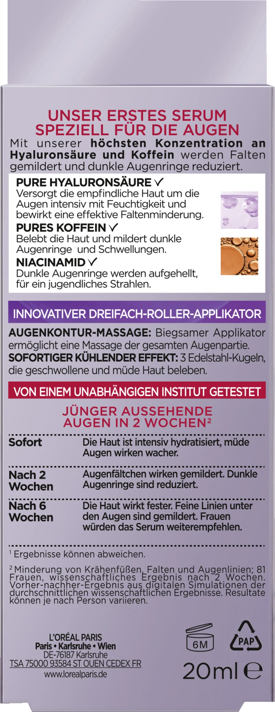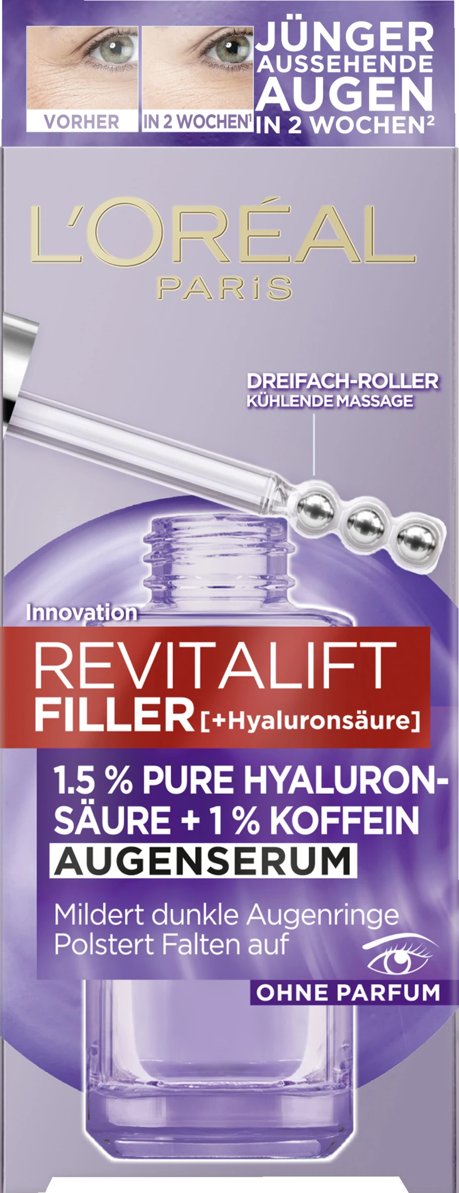 Das erste Revitalift Filler Serum speziell für die Augen: Mit 1,5% Hyaluronsäure und 1% Koffein werden Falten gemildert und dunkle Augenringe reduziert. Pure Hyaluronsäure versorgt die empfindliche Haut intensiv mit Feuchtigkeit und bewirkt eine effektive Faltenmilderung. Pures Koffein belebt die Haut und mildert dunkle Augenringe und Schwellungen. Mit 4% Niacinamid werden dunkle Augenringe aufgehellt, für ein jugendliches Strahlen. Das Serum lässt sich mit dem innovativen Dreifach-Kugel-Applikator auftragen. Der biegsame Applikator ermöglicht eine Massage der gesamten Augenpartie und erzeugt einen sofortigen kühlenden Effekt. Die 3 Edelstahl-Kugeln beleben die geschwollene und müde Haut. Das Ergebnis – jünger aussehende Augen in 2 Wochen! Sofort ist die Haut intensiv hydratisiert und müde Augen wirken wachen. Nach 2 Wochen wirken Augenfältchen gemildert und dunkle Augenringe sind reduziert. Nach 6 Wochen wirkt die Haut fester. Feine Linien unter den Augen sind gemildert.