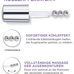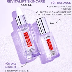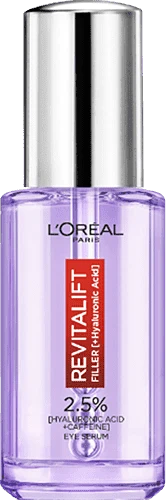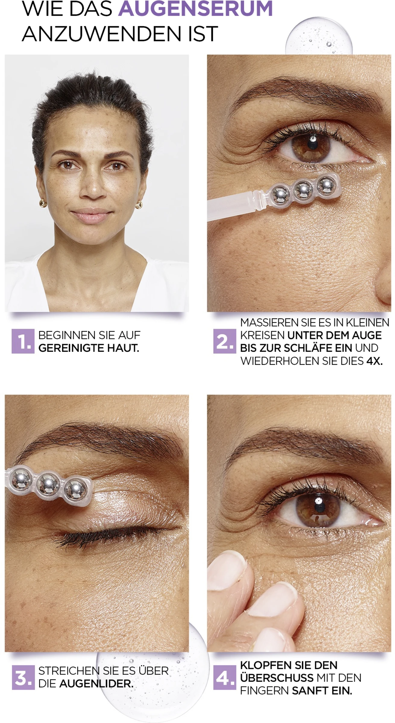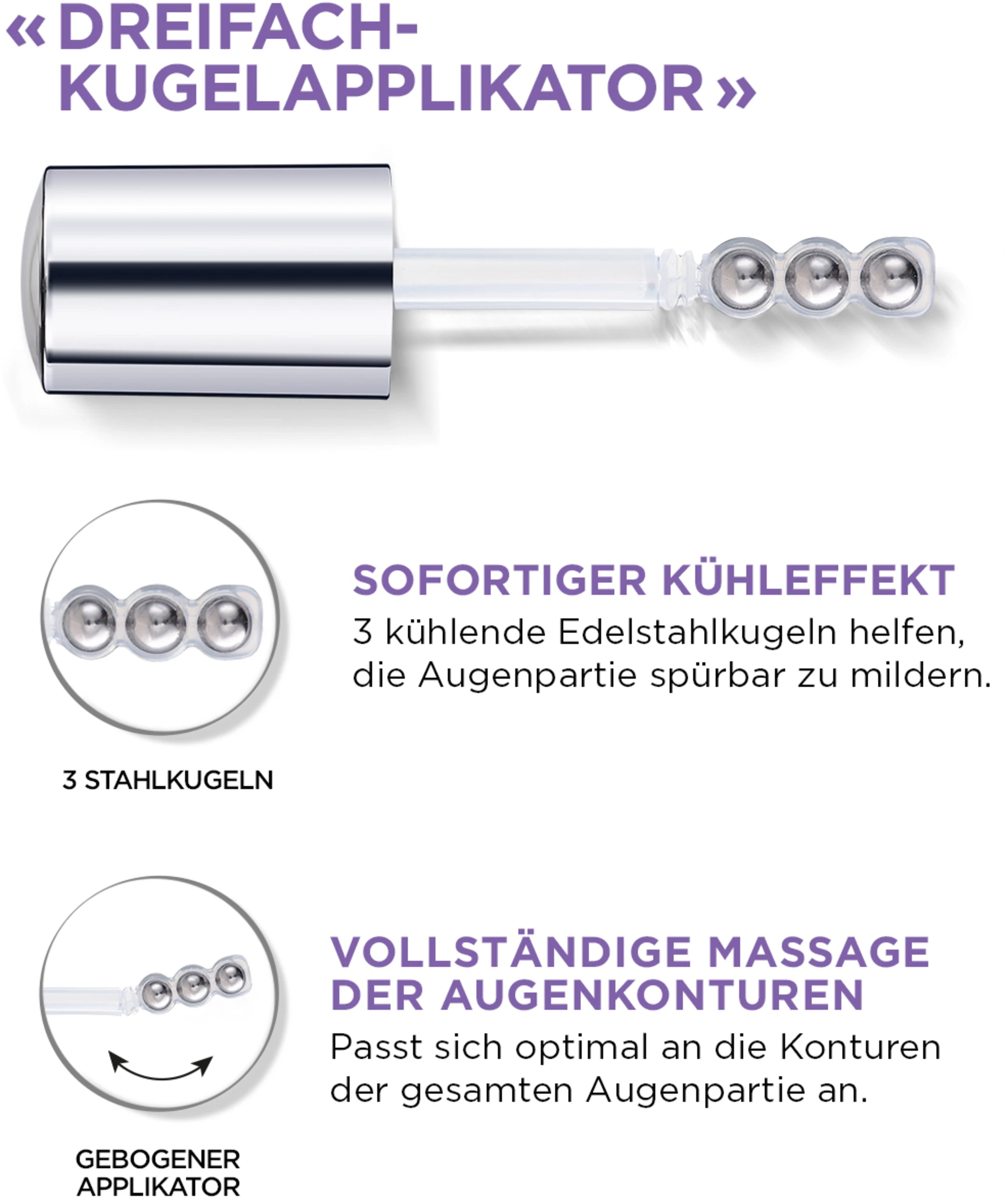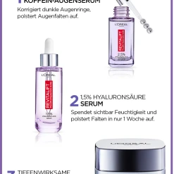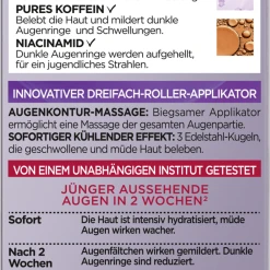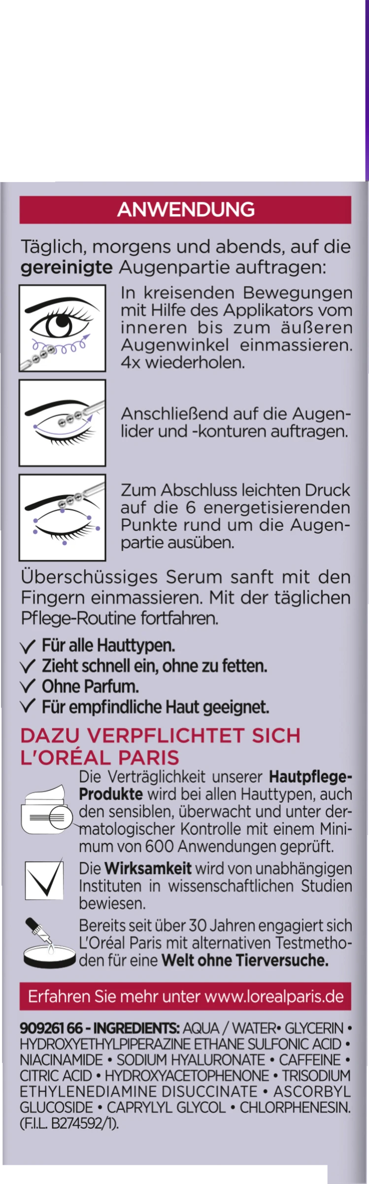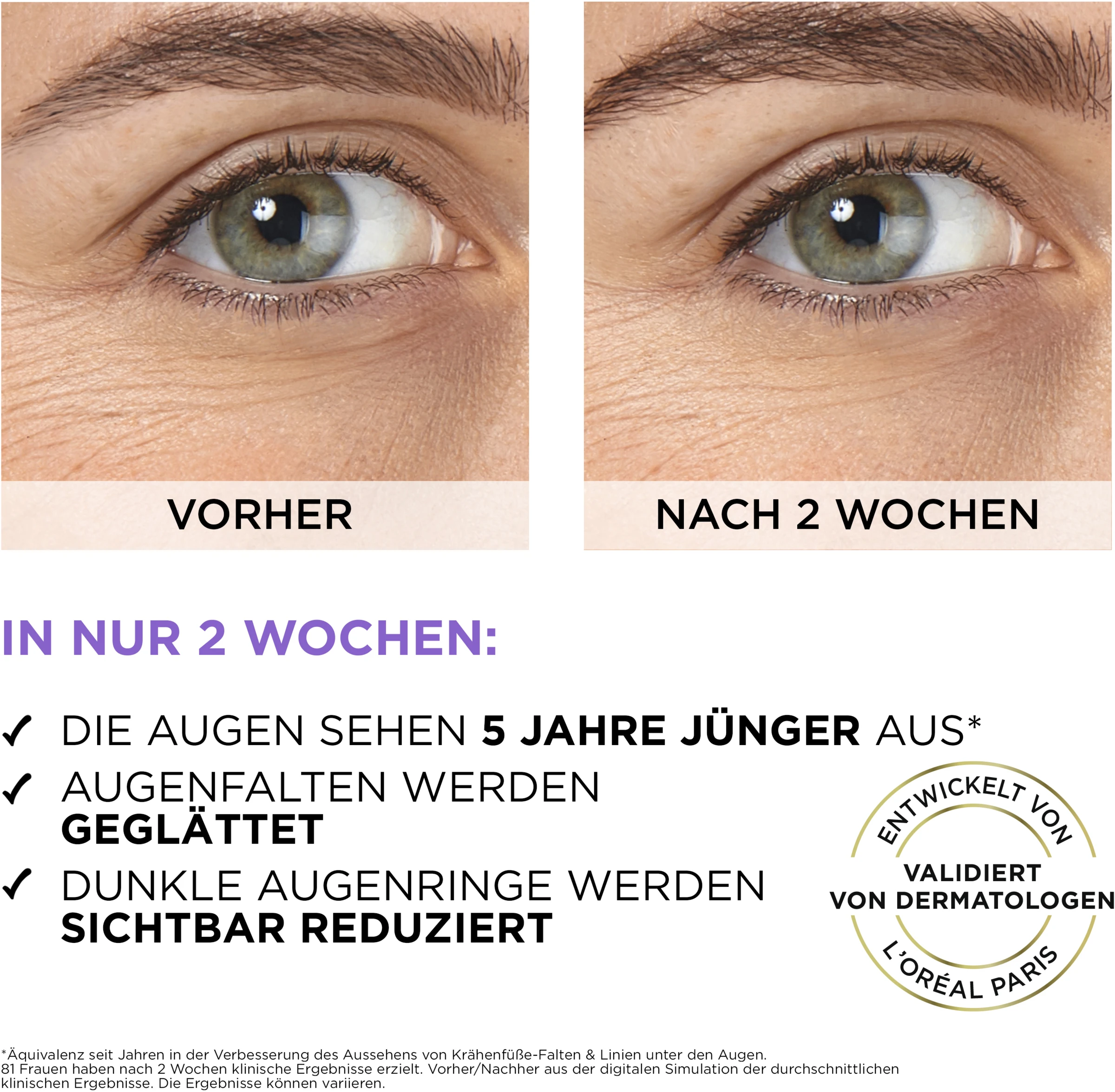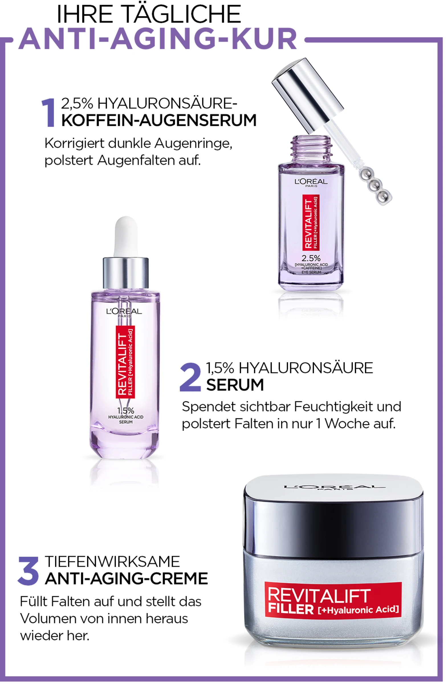 Das erste Revitalift Filler Serum speziell für die Augen: Mit 1,5% Hyaluronsäure und 1% Koffein werden Falten gemildert und dunkle Augenringe reduziert. Pure Hyaluronsäure versorgt die empfindliche Haut intensiv mit Feuchtigkeit und bewirkt eine effektive Faltenmilderung. Pures Koffein belebt die Haut und mildert dunkle Augenringe und Schwellungen. Mit 4% Niacinamid werden dunkle Augenringe aufgehellt, für ein jugendliches Strahlen. Das Serum lässt sich mit dem innovativen Dreifach-Kugel-Applikator auftragen. Der biegsame Applikator ermöglicht eine Massage der gesamten Augenpartie und erzeugt einen sofortigen kühlenden Effekt. Die 3 Edelstahl-Kugeln beleben die geschwollene und müde Haut. Das Ergebnis – jünger aussehende Augen in 2 Wochen! Sofort ist die Haut intensiv hydratisiert und müde Augen wirken wachen. Nach 2 Wochen wirken Augenfältchen gemildert und dunkle Augenringe sind reduziert. Nach 6 Wochen wirkt die Haut fester. Feine Linien unter den Augen sind gemildert.