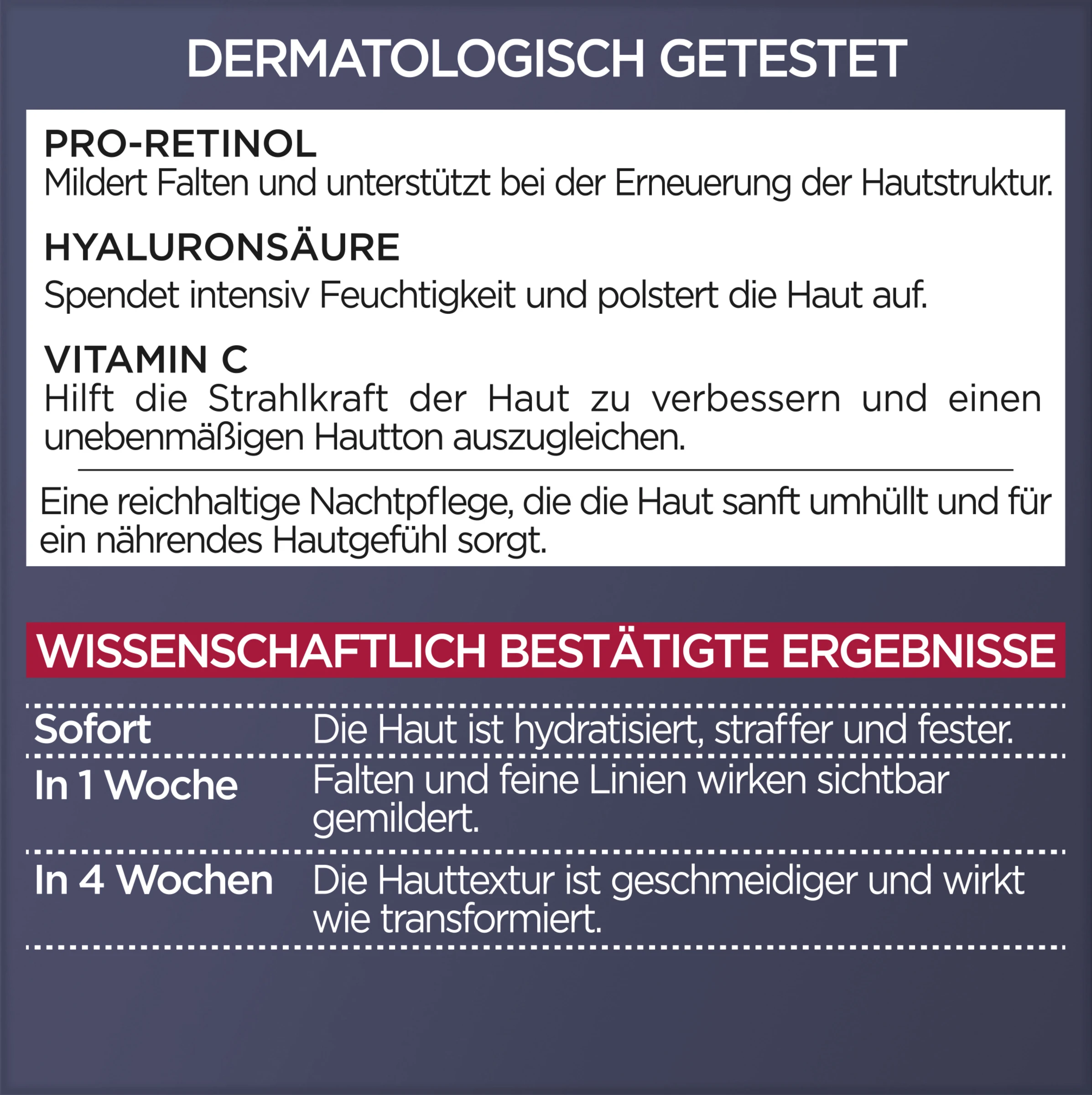 Sorgen Sie mit der Revitalift Laser X3 Dreifach-Power Anti-Age Nachtcreme mit Pro-Retinol + Hyaluronsäure + Vitamin C von L’Oréal Paris für einen jugendlichen und strahlenden Teint. Die hautstraffende Gesichtscreme spendet der Haut intensiv Feuchtigkeit, wirkt regenerierend und mildert Falten. So sorgt die Anti-Aging Nachtcreme mit jeder Anwendung für ein gefestigtes und regeneriertes Hautbild.