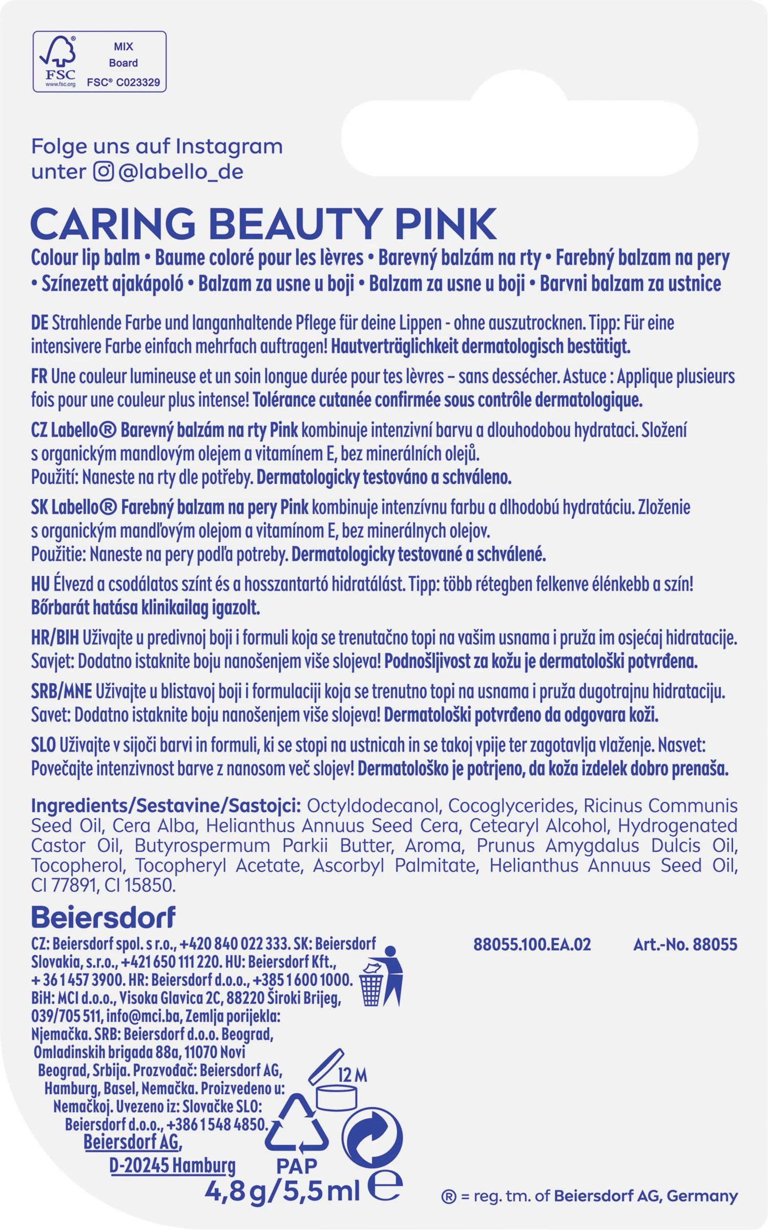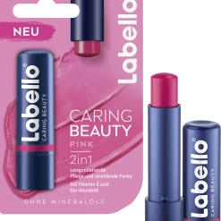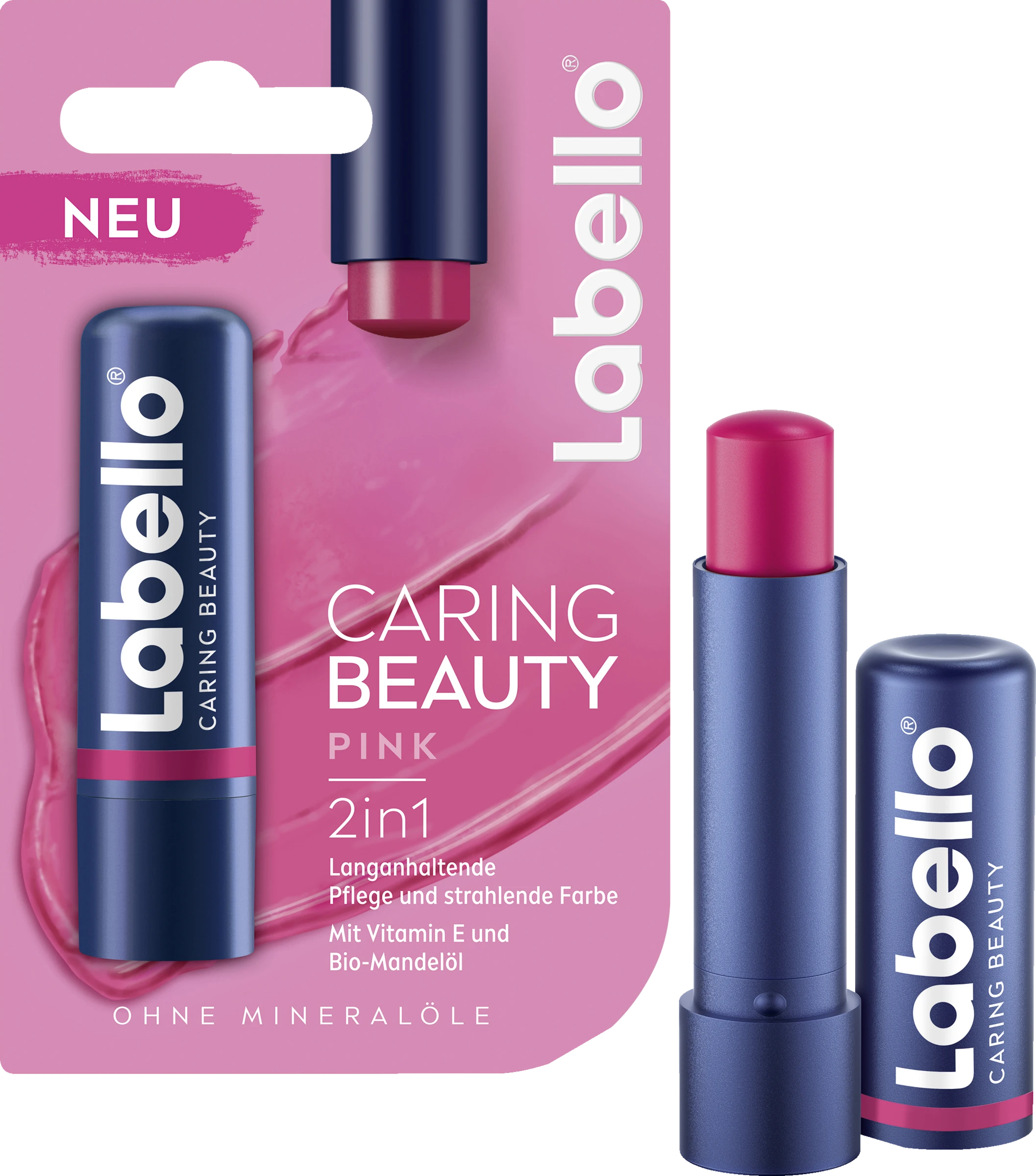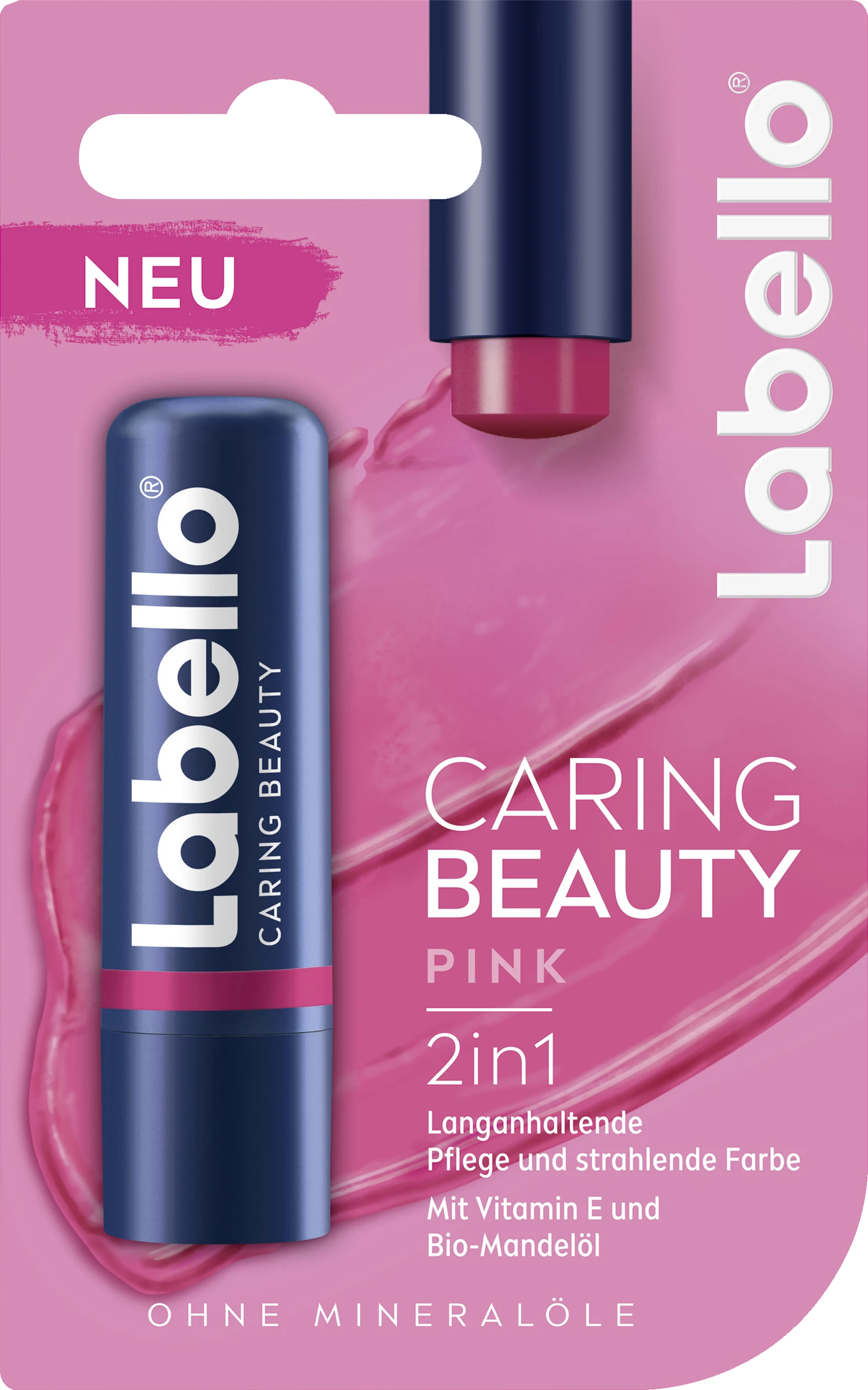 Labello Caring Beauty Pink kombiniert Farbpigmente mit der bewährten Pflege von Labello. Die mineralölfreie Formel mit Sheabutter, Bio-Mandelöl, Vitamin E und einem leicht blumigen Duft wurde speziell für den täglichen Gebrauch entwickelt. Die Formel hinterlässt ein strahlendes Finish ohne auszutrocknen, pflegt langanhaltend und ist einfach gleichmäßig aufzutragen!