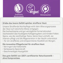 Erlebe das lavera Gefühl spürbar strafferer Haut über Nacht. Die straffende Nachtpflege mit 3-fach-Hyaluron und dem Power-Wirkstoff Bakuchiol wirkt dem Alterungsprozess der Haut auf natürliche Weise entgegen. Die hochwirksame und gut verträgliche Formel stimuliert nachweislich das hauteigene Kollagensystem und mindert Falten. Spüre, wie die reichhaltige Textur deine Haut umhüllt, sie intensiv pflegt und die Regeneration in der Nacht unterstützt – für ein strafferes und erholtes Hautbild am Morgen.