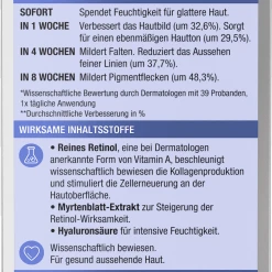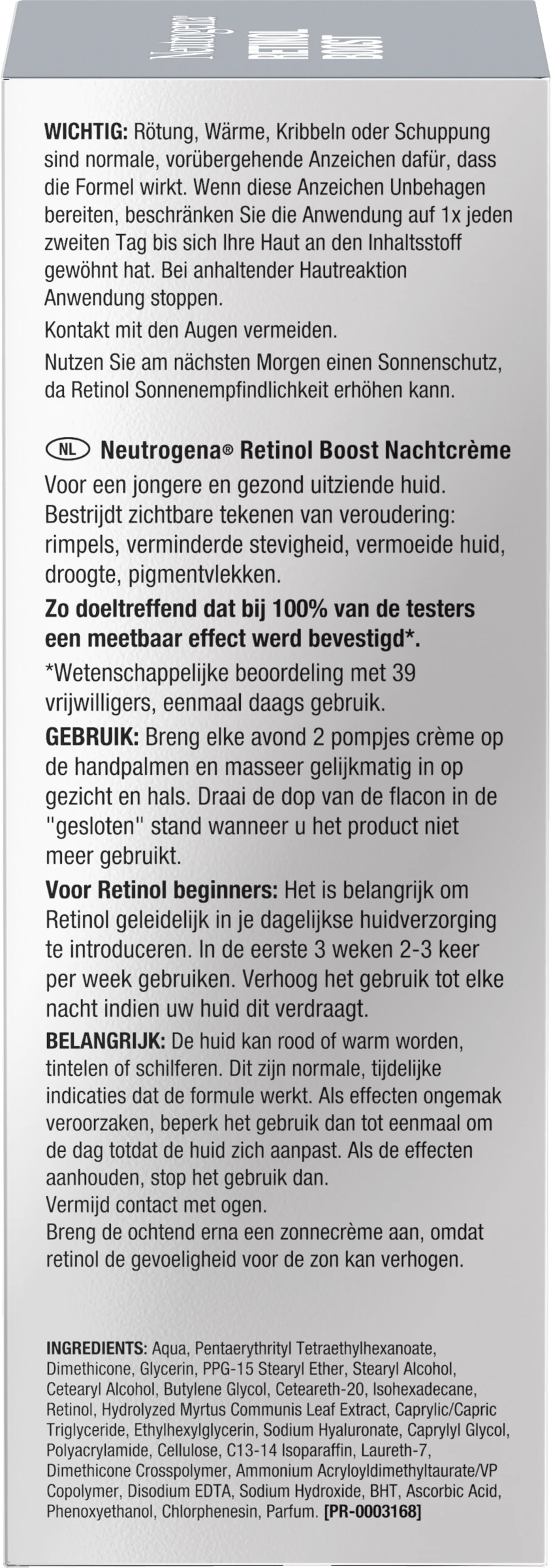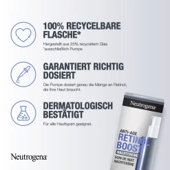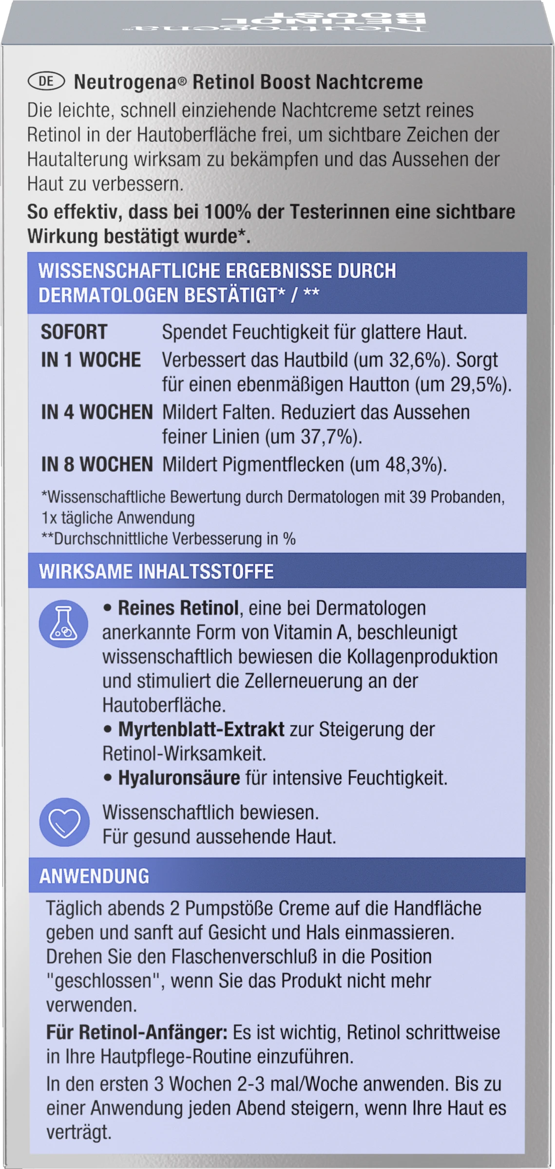 Die Neutrogena Retinol Boost Nachtcreme ist eine schnell einziehende Anti-Age Nachtpflege mit Retinol, Myrtenblatt-Extrakt & Hyaluronsäure und sorgt für jünger & gesund aussehende Haut. Die effektive Gesichtscreme für die Nacht bekämpft sichtbare Zeichen der Hautalterung: Falten, verringerte Straffheit, müde Haut, Trockenheit und Pigmentflecken. Zusätzlich verbessert die Anti-Age Creme das Hautbild, sorgt für einen ebenmäßigen Hautton und spendet sofort Feuchtigkeit. Die einzigartige Formel kombiniert reines Retinol zur Förderung der Kollagenproduktion, Myrtenblatt-Extrakt zur Steigerung der Retinol-Wirksamkeit und Hyaluronsäure für intensive Feuchtigkeit und pralle Haut. Die Anti-Age Nachtcreme für das Gesicht ist so effektiv, dass bei 100% der Testerinnen eine sichtbare Wirkung bestätigt wurde*.