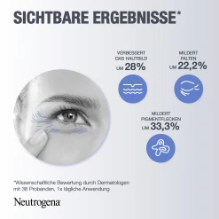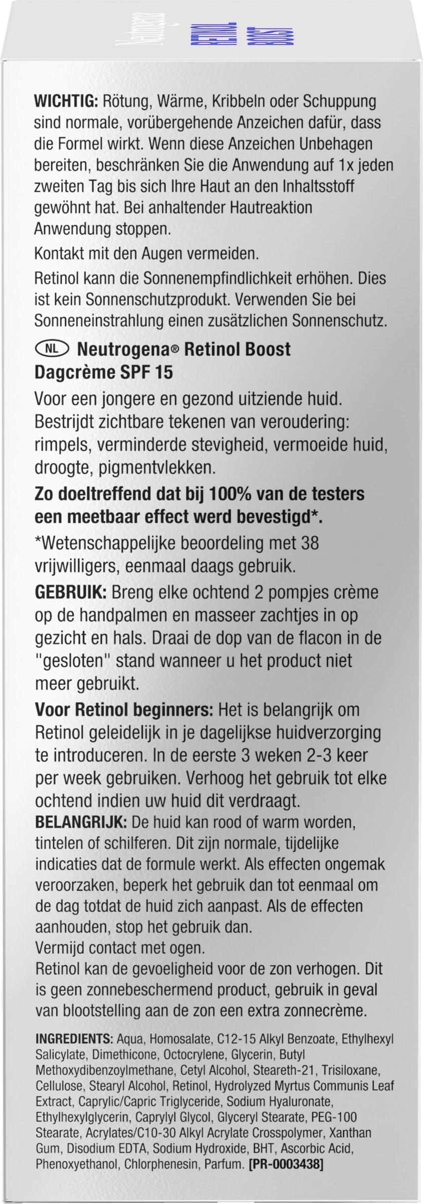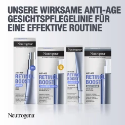 Die Neutrogena Retinol Boost Tagescreme mit LSF 15 ist eine schützende Anti-Age Feuchtigkeitscreme mit Retinol, Myrtenblatt-Extrakt & Hyaluronsäure und sorgt für jünger & gesund aussehende Haut. Die effektive Gesichtscreme bekämpft sichtbare Zeichen der Hautalterung: Falten, verringerte Straffheit, müde Haut, Trockenheit und Pigmentflecken. Zusätzlich schützt die Anti-Age Creme die Haut vor vorzeitiger lichtbedingter Hautalterung, verbessert das Hautbild und sorgt für einen ebenmäßigen Hautton. Die einzigartige Formel kombiniert reines Retinol zur Förderung der Kollagenproduktion, Myrtenblatt-Extrakt zur Steigerung der Retinol-Wirksamkeit und Hyaluronsäure für intensive Feuchtigkeit und pralle Haut. Die Anti-Age Tagescreme für das Gesicht ist so effektiv, dass bei 100% der Testerinnen eine sichtbare Wirkung bestätigt wurde*.