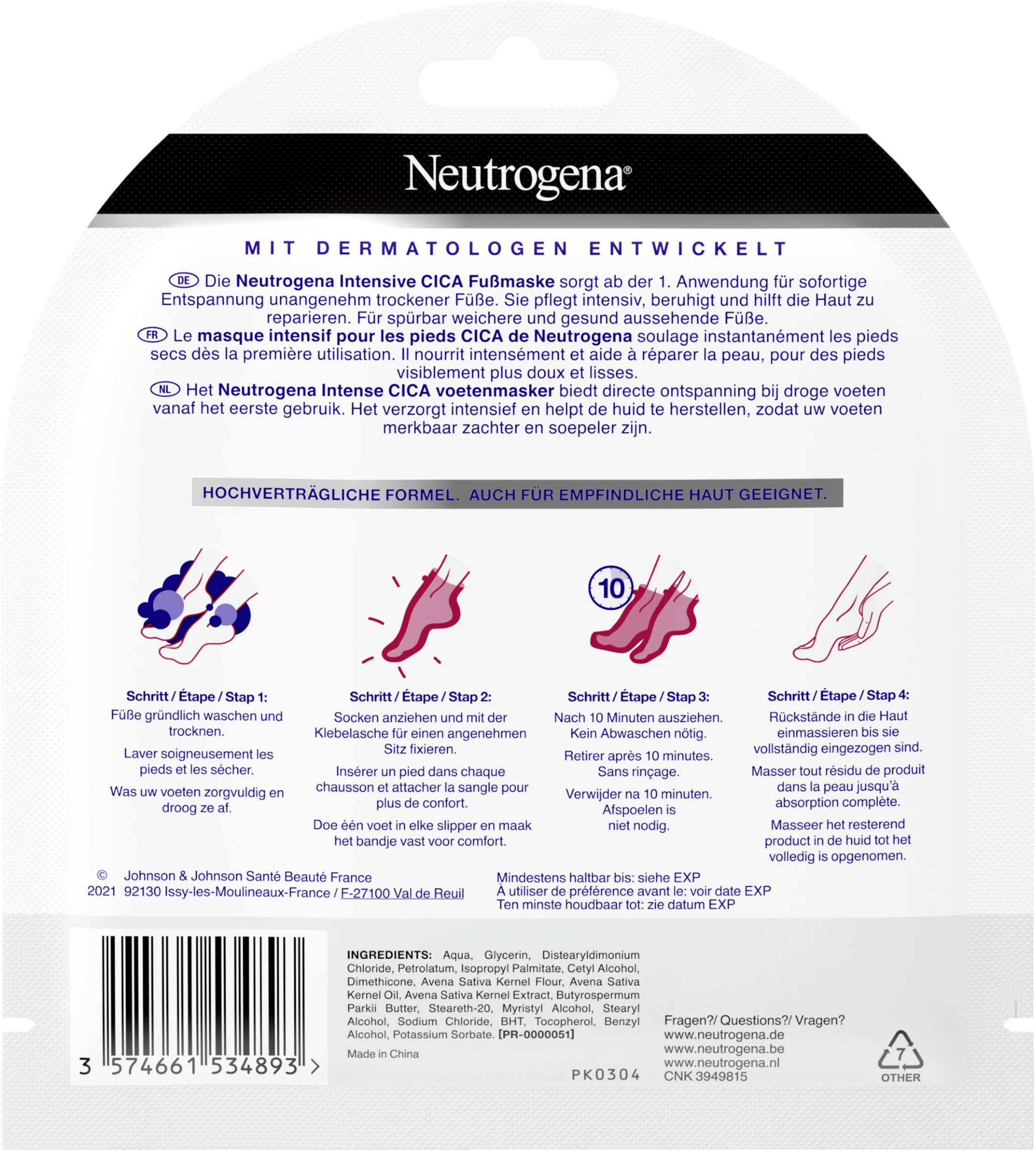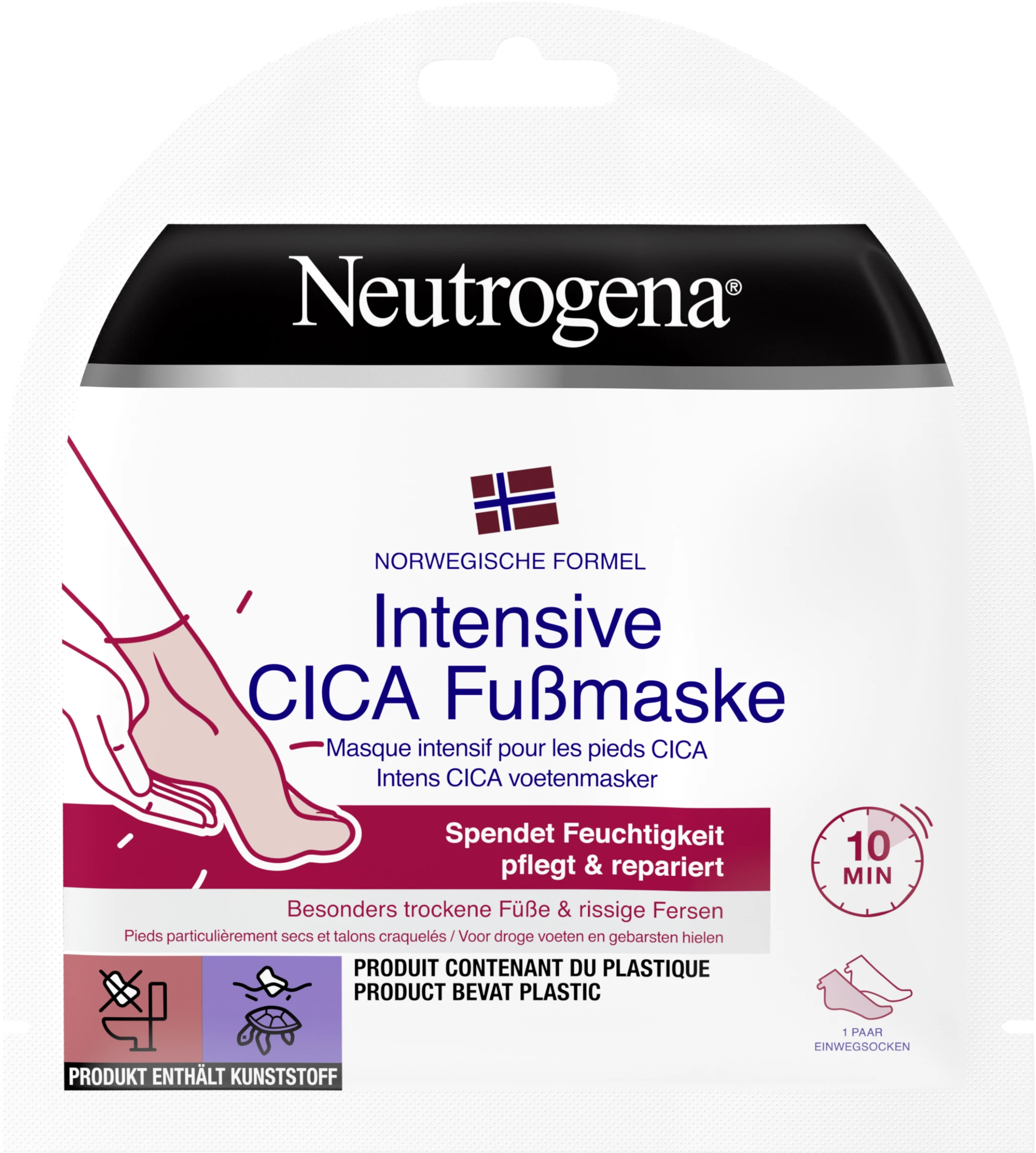 Die Neutrogena intensive CICA Fußmaske sorgt ab der 1. Anwendung für sofortige Entspannung unangenehm trockener Füße. Für spürbar weichere und gesund aussehende Füße.