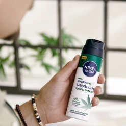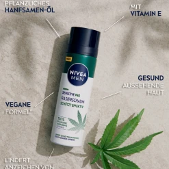 Der NIVEA MEN SENSITIVE PRO Rasierschaum schützt sofort vor Hautirritationen und weicht die Barthaare auf. Trockenheit, Hautirritationen, Müdigkeit und andere Zeichnen von Hautstress werden gelindert. Der Sensitive Pro Rasierschaum sorgt für eine natürliche Rasur und eine gesund aussehende Haut. Diese vegane* Formel für Männer beinhaltet 100% pflanzliches Hanfsamen-Öl und Vitamin E. 93% der Inhaltstoffe haben einen natürlichen Ursprung. Aus Liebe zur Haut und Umwelt ist die Dose aus 25% recyceltem Aluminium. HAUTVERTRÄGLICHKEIT BEI MÄNNERN MIT EMPFINDLICHER HAUT DERMATOLOGISCH BESTÄTIGT.