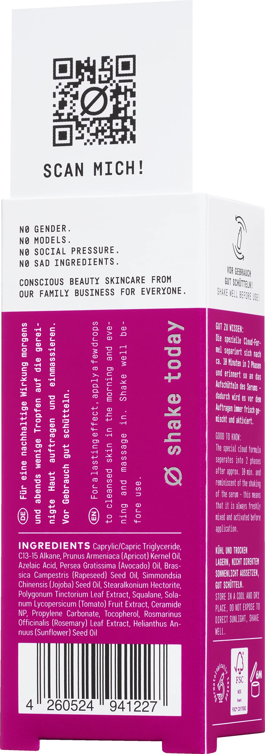 HYPERCALM®-FORMEL Die spezielle Cloud-Formel von ø shake today separiert sich nach ca. 10 Minuten in 2 Phasen und erinnert so an das frische Aufschütteln des Serums – dadurch wird die Flüssigkeit vor dem Auftragen immer frisch gemischt und aktiviert. Die Formel mit Indirubin aus lokal angebauten Färberpflanzen zeigt bei konstanter Anwendung über einen Zeitraum von 28 Tagen eine Stärkung der Hautbarriere und Verminderung der Hautempfindlichkeit. Unsere besten Inhaltsstoffe für eine aktive Hautberuhigung: 5% Azelainsäure wirken antibakteriell, hautberuhigend und antikomedogen. Die Neigung zu „Maskne“, Blackheads und Pickeln wird deutlich reduziert. Ein farbloser Tomatenextrakt aus nachhaltigem Anbau reduziert Rötungen und Irritationen. Ceramide, Aprikosen- und Avocadoöl pflegen und stärken die Haut zusätzlich. Azelainsäure (die in Weizen, Roggen und Gerste vorkommt) ist ein naturidentisches Antioxidans, das helfen kann, Entzündungen zu reduzieren. Man glaubt außerdem, dass Azelainsäure eine antibakterielle Wirkung gegen akne-auslösende Bakterien, Hyperpigmentierung und Rosacea hat. Azelainsäure wirkt anders als Alpha- und Beta-Hydroxysäuren, sodass man sie mit AHA- und BHA-Produkten gleichzeitig verwenden kann. Da es sich hierbei um starke aktive Inhaltsstoffe handelt, sollte man alle neuen Säuren nur schrittweise in die Hautpflegeroutine einführen. Pflegendes Serum gegen Hautstress und Rötungen. Enthält 5% Azelainsäure und Ceramide.