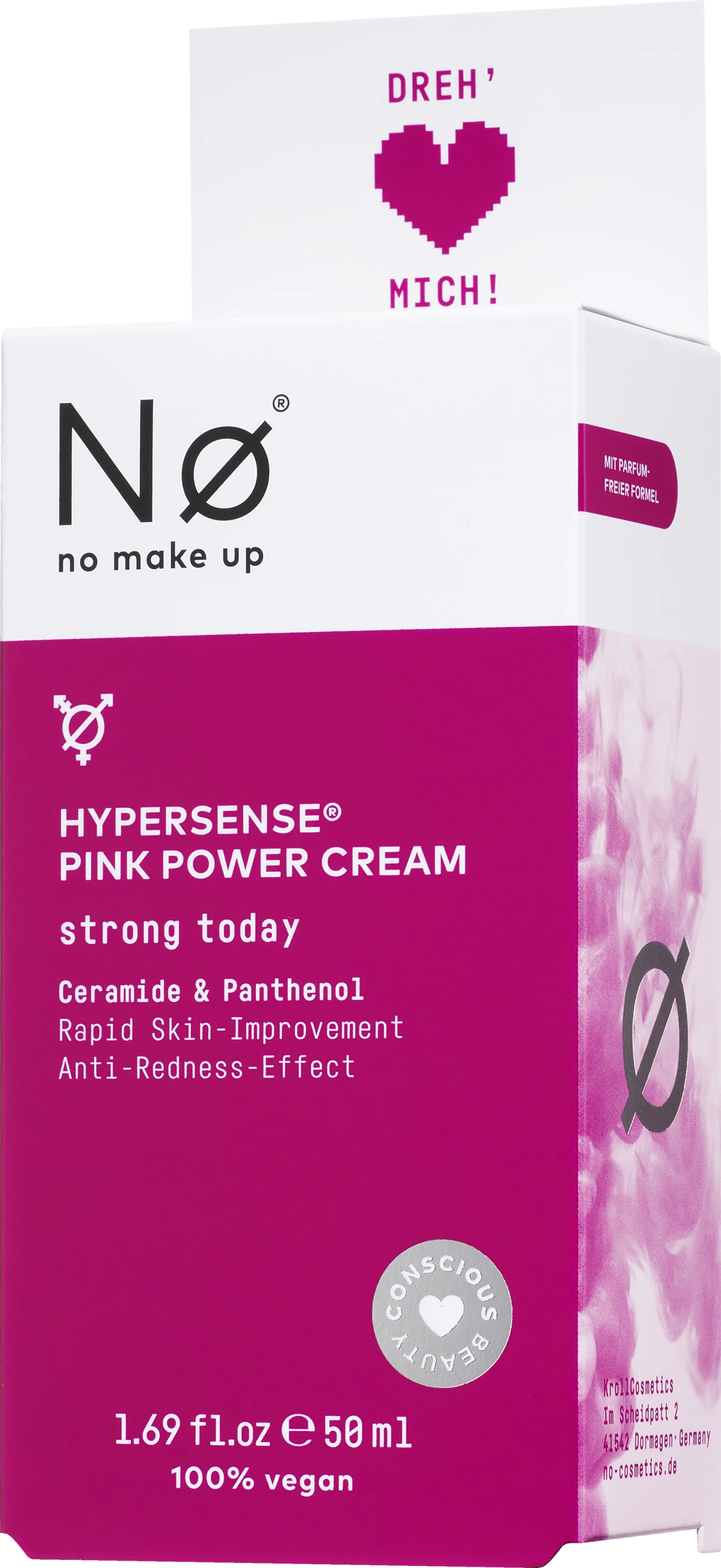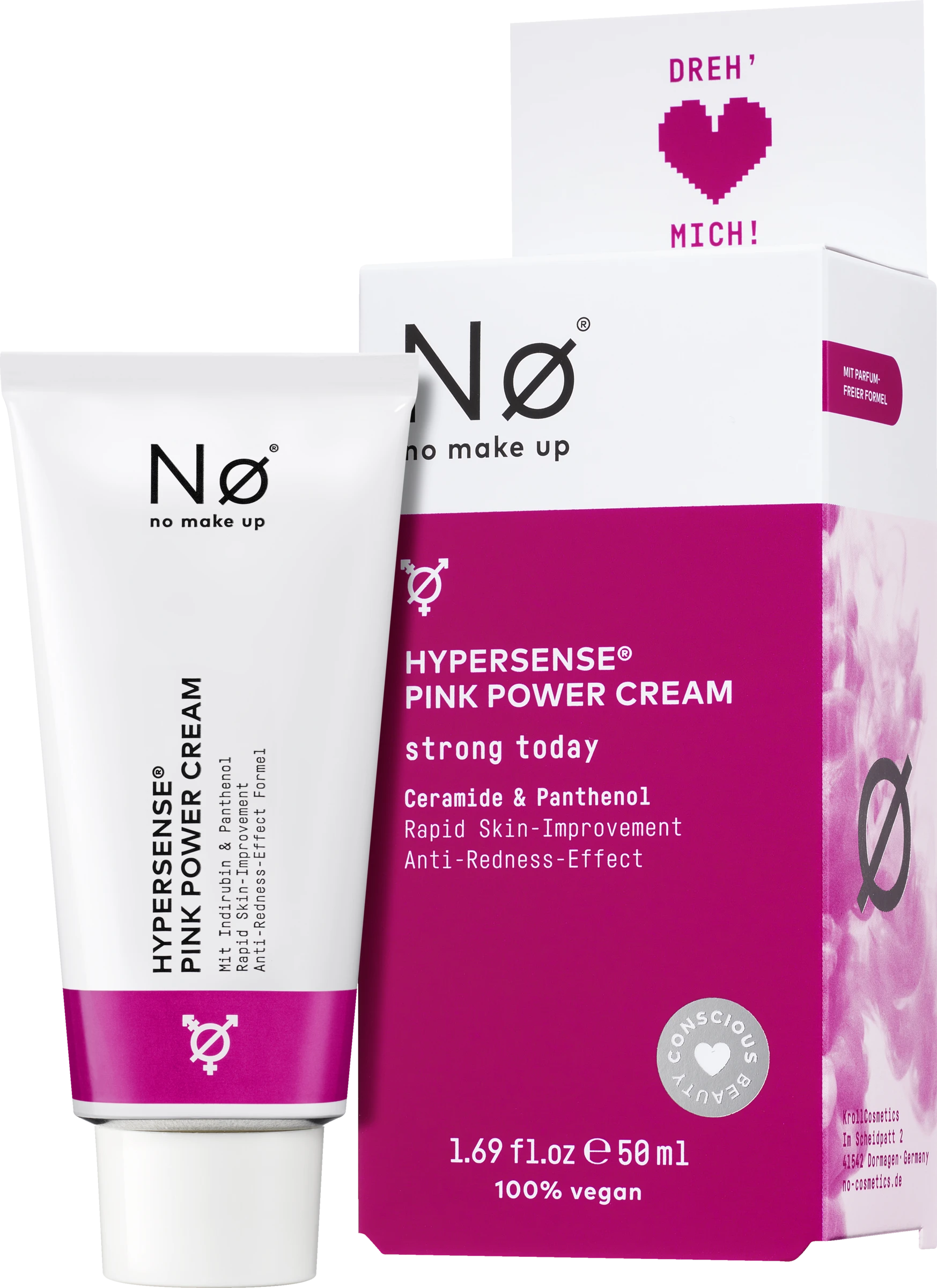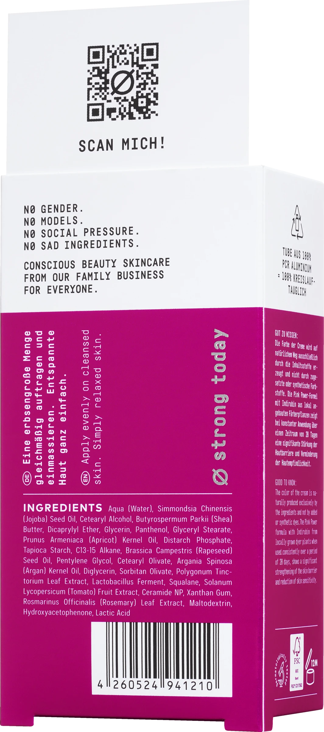 Die ø strong today Creme mit Ceramiden und Panthenol bringt gereizte Haut ins Gleichgewicht und beruhigt diese nachhaltig. Rötungen können dadurch gemindert und Mitessern vorgebeugt werden. Die Farbe der Creme wird auf natürlichem Weg ausschließlich durch die Inhaltsstoffe erzeugt und nicht durch zugesetzte oder synthetische Farbstoffe. Die Pink Power-Formel mit Indirubin aus lokal angebauten Färberpflanzen zeigt bei konstanter Anwendung über einen Zeitraum von 28 Tagen eine signifikante Stärkung der Hautbarriere und Verminderung der Hautempfindlichkeit. Die Neigung zu „Maskne“ wird dabei deutlich reduziert. Ein spezieller, farbloser Tomatenextrakt aus nachhaltigem Anbau reduziert Rötungen und Irritationen. Ein Pflegekomplex aus Ceramiden und Panthenol verbessert das Feuchthaltevermögen der Haut, lindert Juckreiz und wirkt hautberuhigend. Beruhigende Feuchtigkeitscreme gegen Rötungen und Hautstress. Enthält Ceramide, Panthenol und Indirubin.