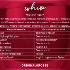 Die Olay Regenerist Whip Tagescreme LSF 30 mit einzigartiger, luftig-leichter Textur spendet sofort Feuchtigkeit und schützt mit LSF30 – ohne zu beschweren. Dank innovativer Active Rush Technologie verwandelt sie sich bei Kontakt mit der Haut in eine flüssige Textur und sorgt so für ein schnelles Einziehen und ein leichtes Hautgefühl mit einem glatten und matten Finish. Die leistungsstarke Formel mit Amino-Peptiden und Vitamin B3 strafft und erneuert die Haut sichtbar und bringt Inhaltsstoffe bis tief in die Hautoberfläche. So bietet sie eine kraftvolle und gleichzeitig luftig-leichte Hautpflege, die zudem vor schädlicher UV-Strahlung schützt – ganz ohne klebriges Gefühl. Verwenden Sie Olay Regenerist täglich 28 Tage lang und sehen Sie, wie sich Ihre Haut verwandelt.