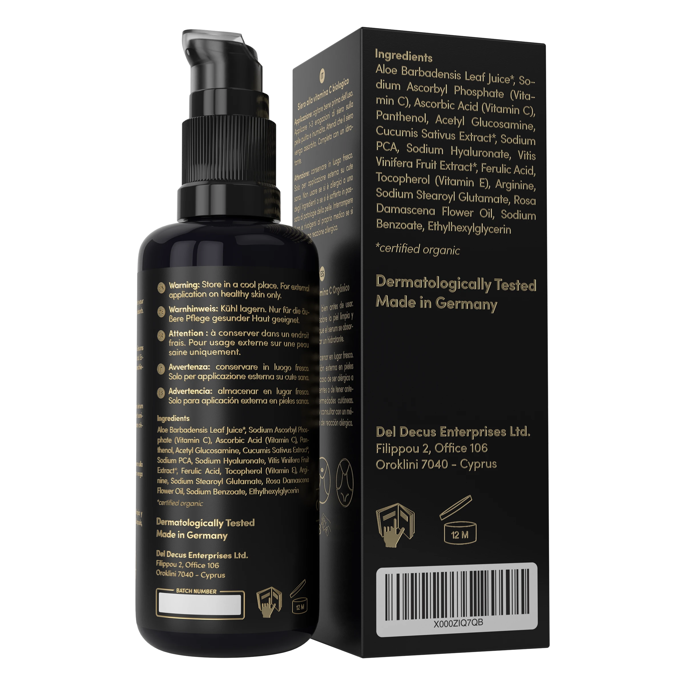 Bio Aloe Vera Direktsaft (Aloe Barbadensis), Natriumascorbylphosphat (Vitamin C), Ascorbinsäure (Vitamin C), Panthenol, Acetylglucosamin, Bio Gurken Extrakt (Cucumis Sativus), Sodium PCA, Natriumhyaluronat (Hyaluronsäure), Bio Weintrauben Fruchtextrakt (Vitis Vinifera), Ferulasäure, Tocopherol (Vitamin E), Arginin, Natrium Stearoyl Glutamat, Rosa Damascena (Damaszener-Rose) Blütenöl, Natriumbenzoat, Ethylhexylglycerin.