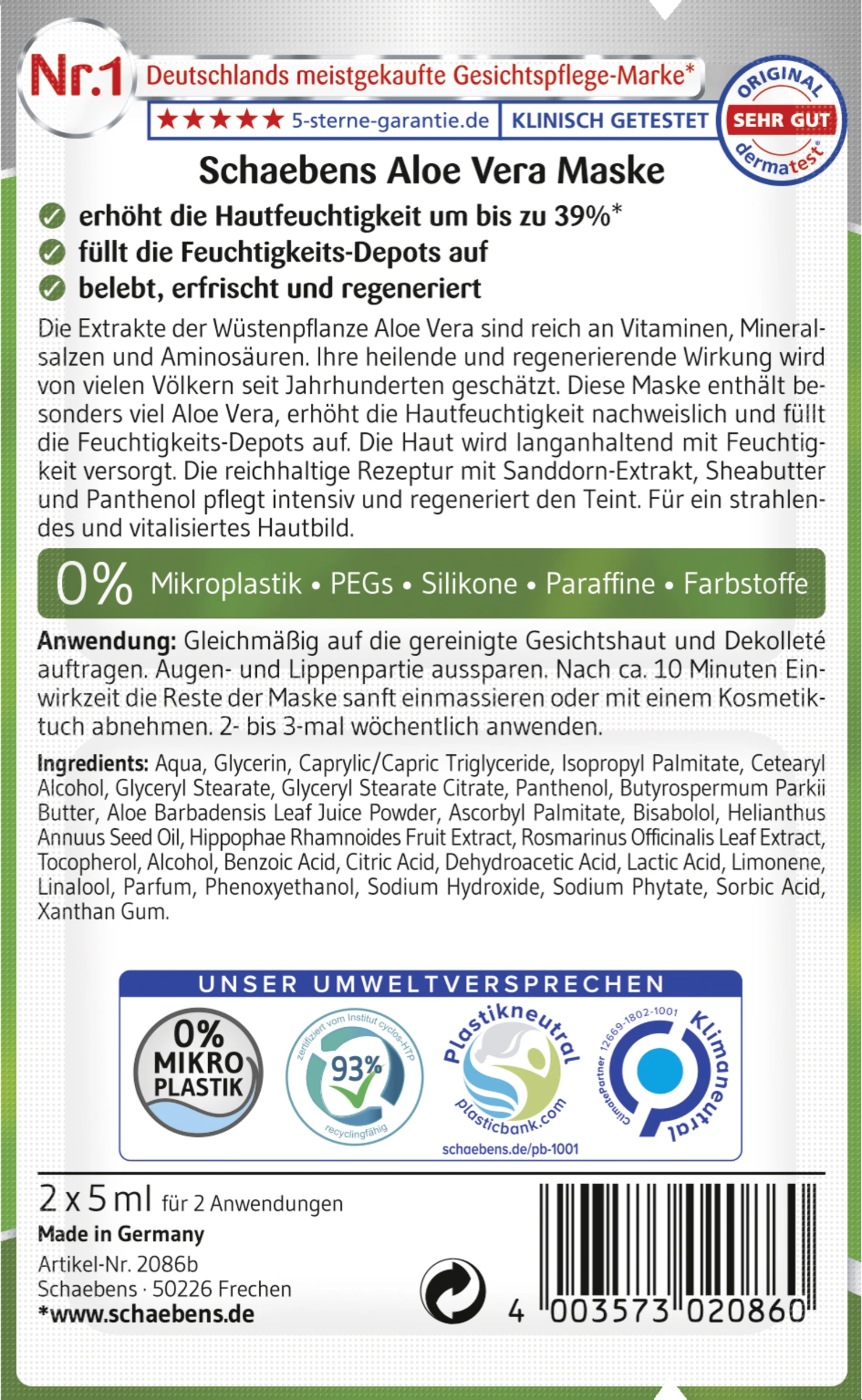 Die Extrakte der Wüstenpflanze Aloe Vera sind reich an Vitaminen, Mineralsalzen und Aminosäuren. Ihre heilende und regenerierende Wirkung wird von vielen Völkern seit Jahrhunderten geschätzt. Diese Maske enthält besonders viel Aloe Vera, erhöht die Hautfeuchtigkeit nachweislich und füllt die Feuchtigkeits-Depots auf. Die Haut wird langanhaltend mit Feuchtigkeit versorgt. Die reichhaltige Rezeptur mit Sanddorn-Extrakt, Sheabutter und Panthenol pflegt intensiv und regeneriert den Teint. Für ein strahlendes und vitalisiertes Hautbild.