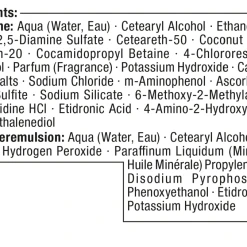 Aqua, Cetearyl Alcohol, Ceteareth-20, Hydrogen Peroxide, Paraffinum Liquidum, Propylene Glycol, Disodium Pyrophosphate, Phenoxyethanol, Etidronic Acid, Potassium Hydroxide.