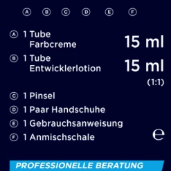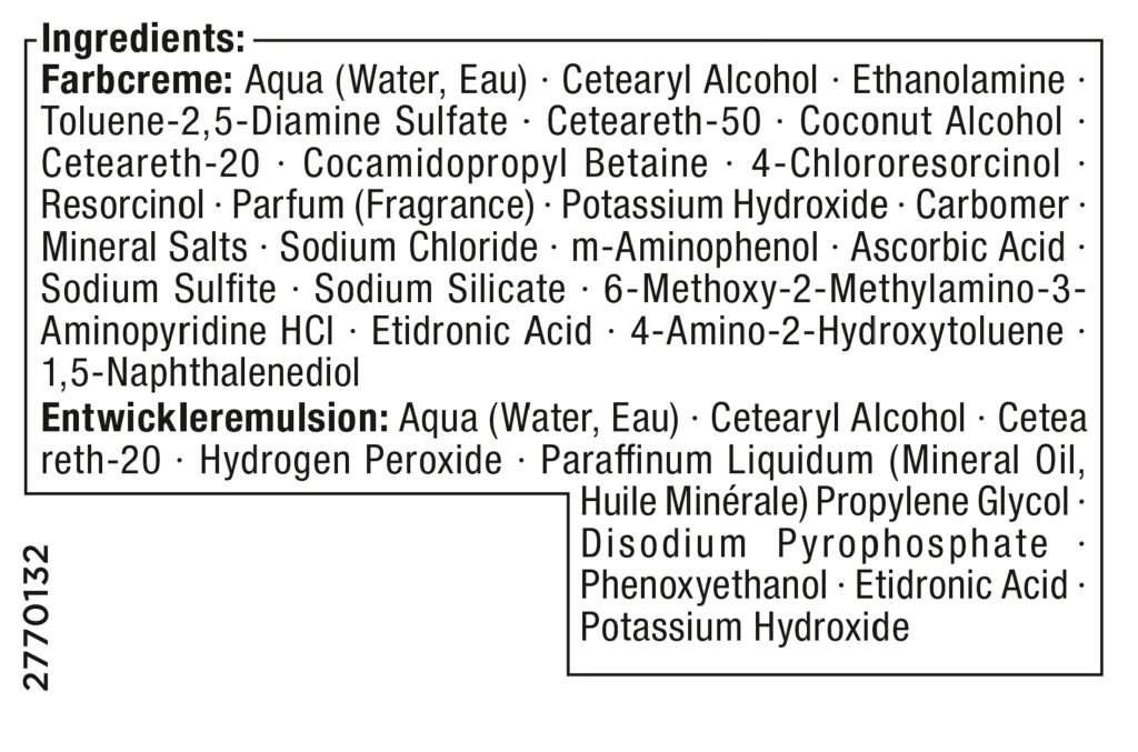 Aqua, Cetearyl Alcohol, Ethanolamine, Toluene-2,5-Diamine Sulfate, Ceteareth-50, Coconut Alcohol, Ceteareth-20, Cocamidopropyl Betaine, 4-Chlororesorcinol, Resorcinol, Parfum, Potassium Hydroxide, Carbomer, Mineral Salts, Sodium Chloride, m-Aminophenol, Sodium Sulfite, Ascorbic Acid, Sodium Silicate, 6-Methoxy-2-Methylamino-3-Aminopyridine HCl, Etidronic Acid, 4-Amino-2-Hydroxytoluene, 1,5-Naphthalenediol.Entwickleremulsion: