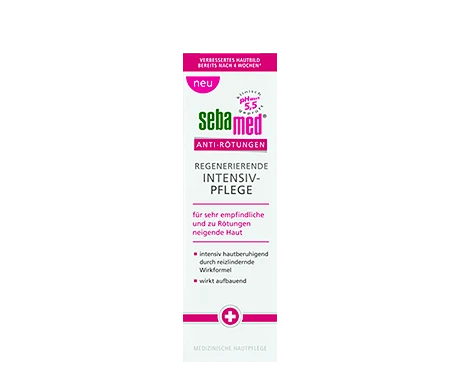 sebamed Anti-Rötungen regenerierende Intensivpflege hilft, bei regelmäßiger Anwendung, der Entstehung neuer Rötungen vorzubeugen und bestehende Rötungen zu mildern. Sehr empfindliche, zu Rötungen neigende Haut ist infolge einer gestörten Hautbarriere und sehr empfindlicher Nervenfasern anfälliger für Reizungen. Schubartige Rötungen, Hitze- und Spannungsgefühl im Gesicht sind die Folge. Durch die Erweiterung der Blutgefäße in der Haut können anhaltende Rötungen entstehen.