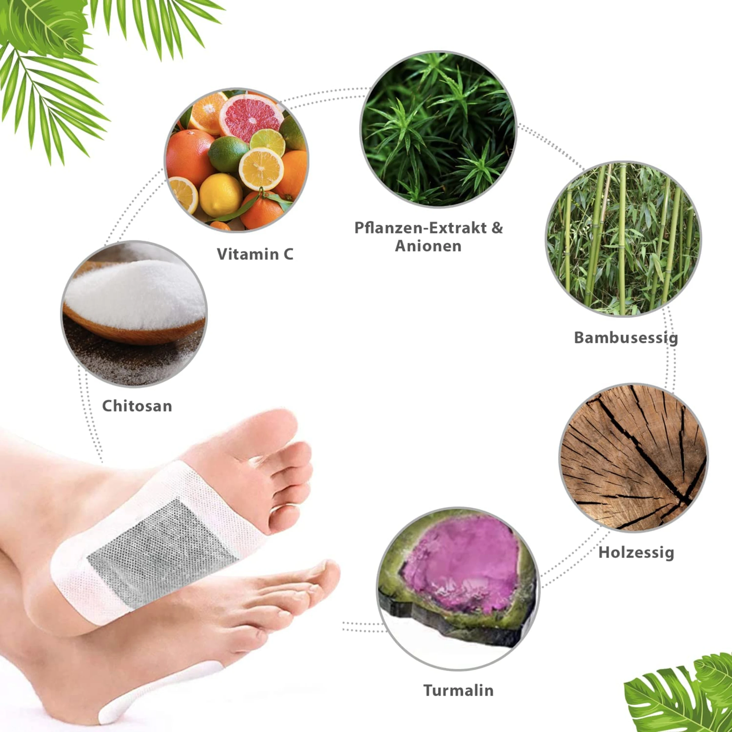 Die Fußpads mit Ingweröl beinhalten natürliche Inhaltsstoffe, wie Bambusessig, Holzessig, Turmalin, Maisstärke, Chitin und Pflanzenfasern.