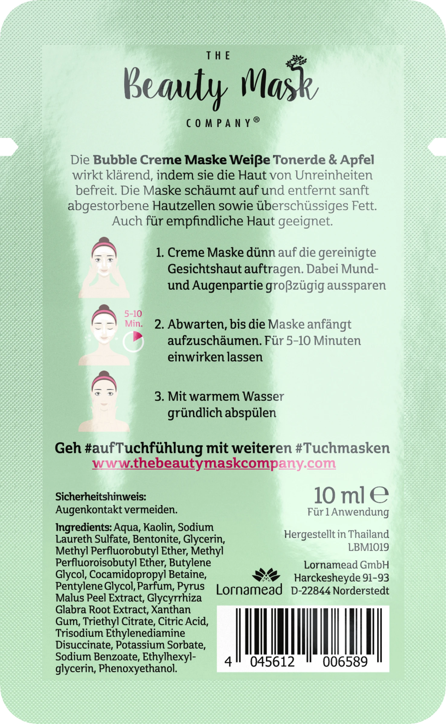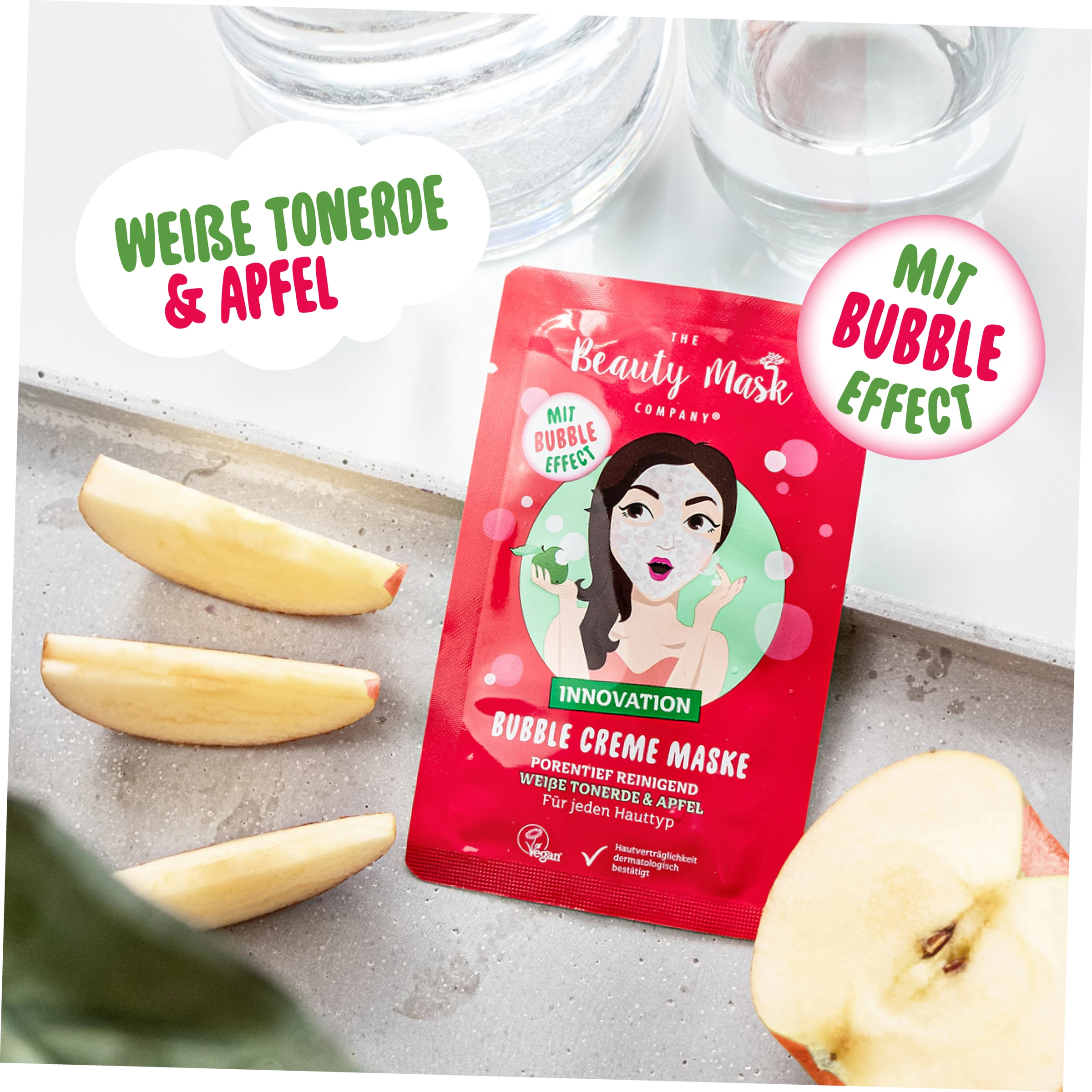 Die Bubble Creme Maske Weiße Tonerde & Apfel wirkt klärend, indem sie die Haut von Unreinheiten befreit. Die Maske schäumt auf und entfernt sanft abgestorbene Hautzellen sowie überschüssiges Fett. Auch für empfindliche Haut geeignet.