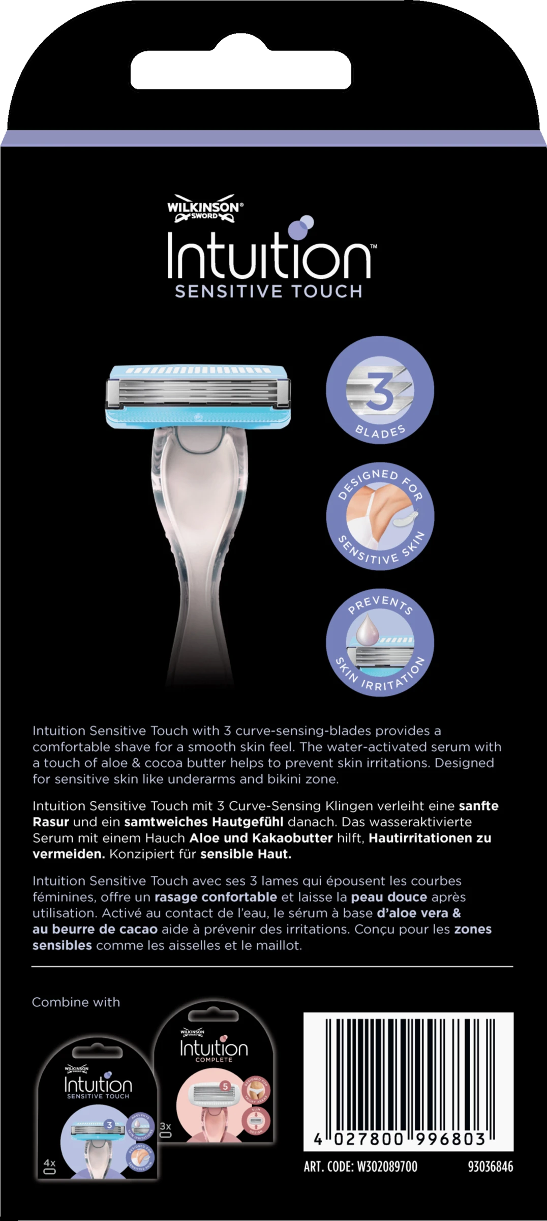 Der Sensitive Touch Rasierer von Wilkinson Intuition mit 3-Curve-Sensing-Klingen verleiht eine sanfte Rasur: Das wasser-aktivierte Serum mit einem Hauch von Aloe vera und Kakaobutter hilft, Hautirritationen vorzubeugen. Er wurde extra konzipiert für sensible Hautzonen wie Achseln und Bikinizone.